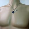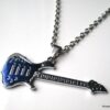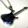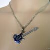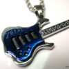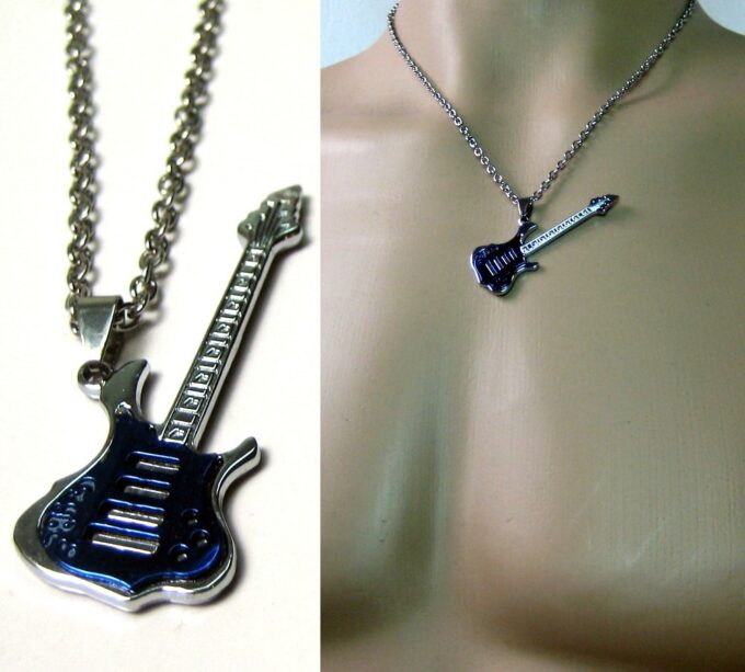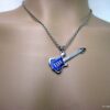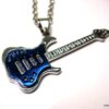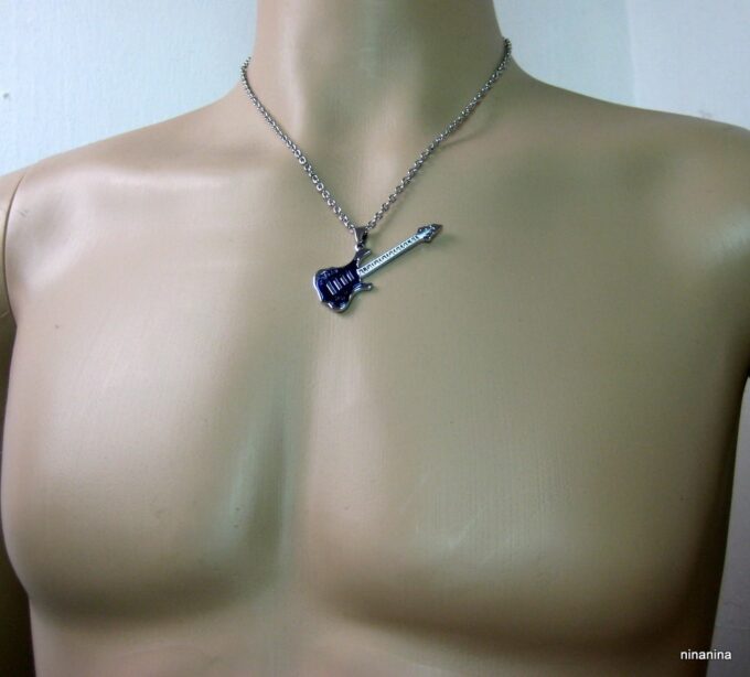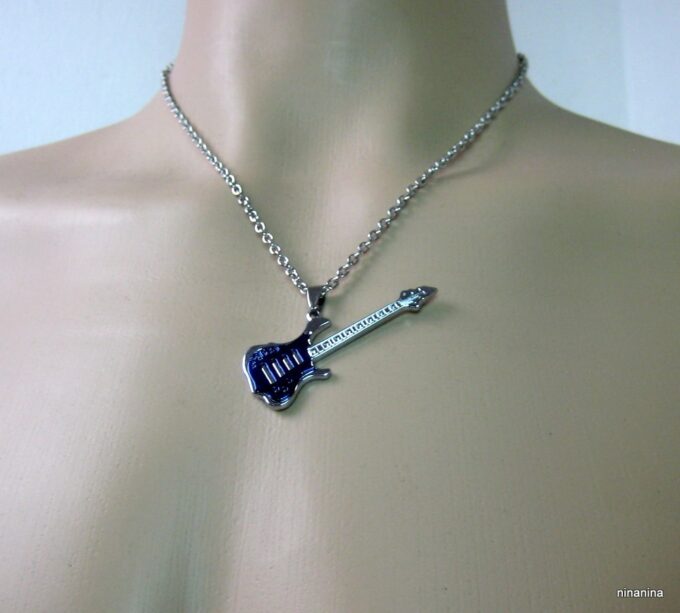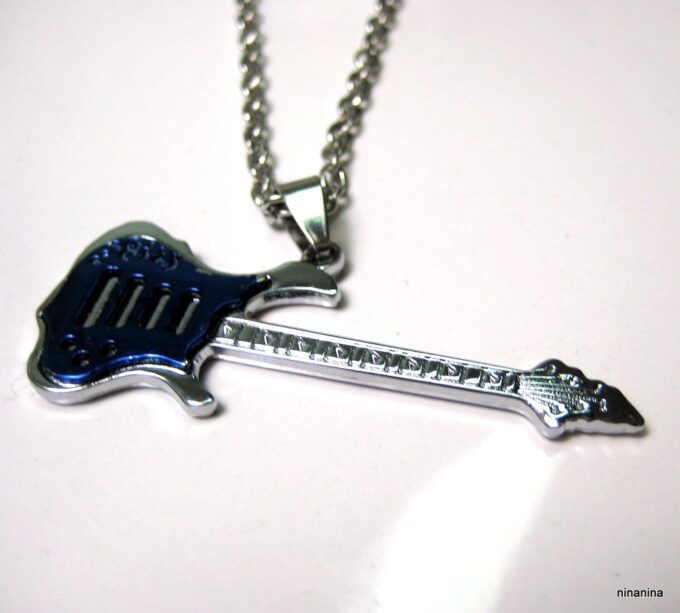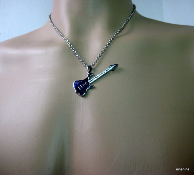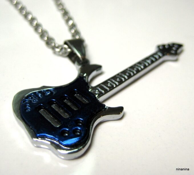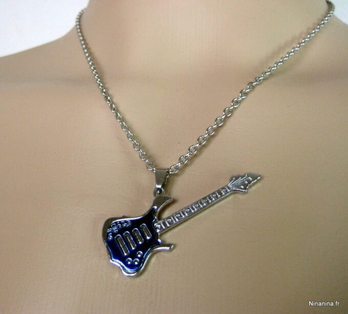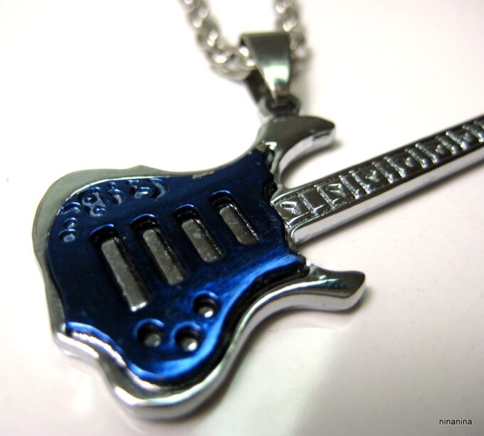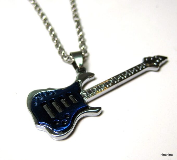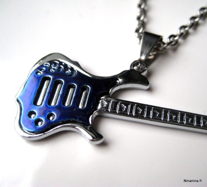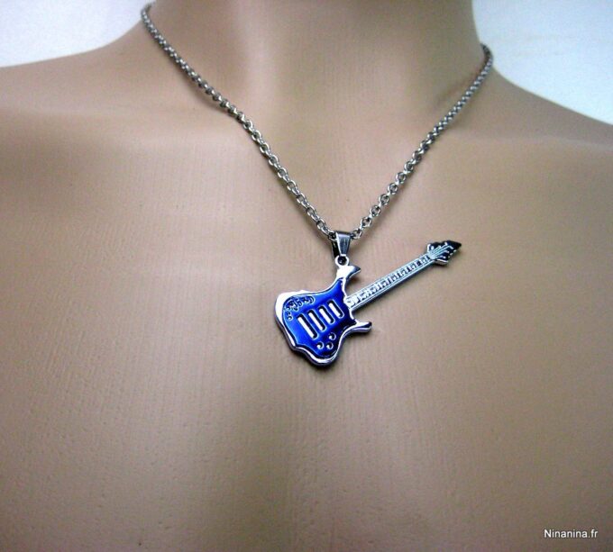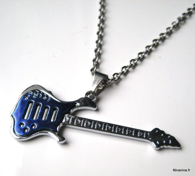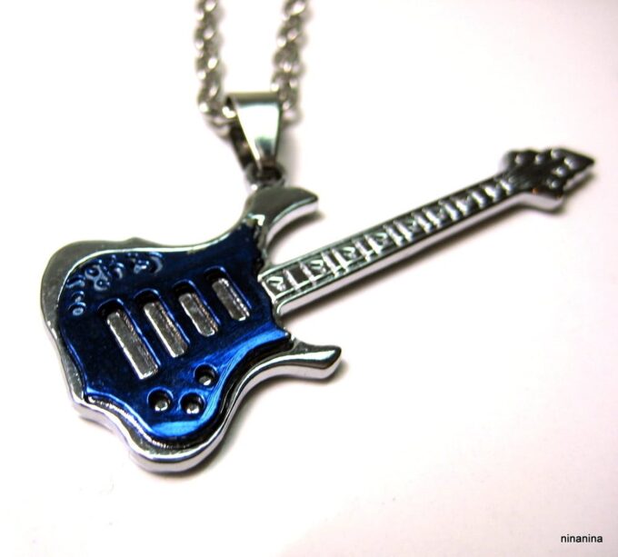 Collier homme guitare bass bleue acier argenté composé d’un pendentif guitare bass en acier inoxydable bleu et argent monté sur une chaine en acier inoxydable.