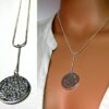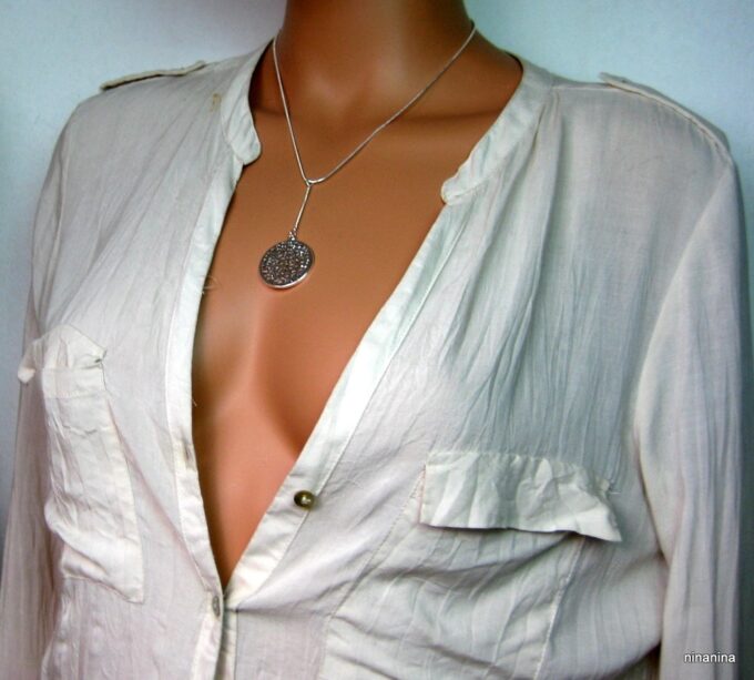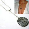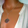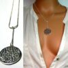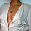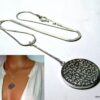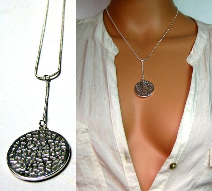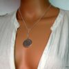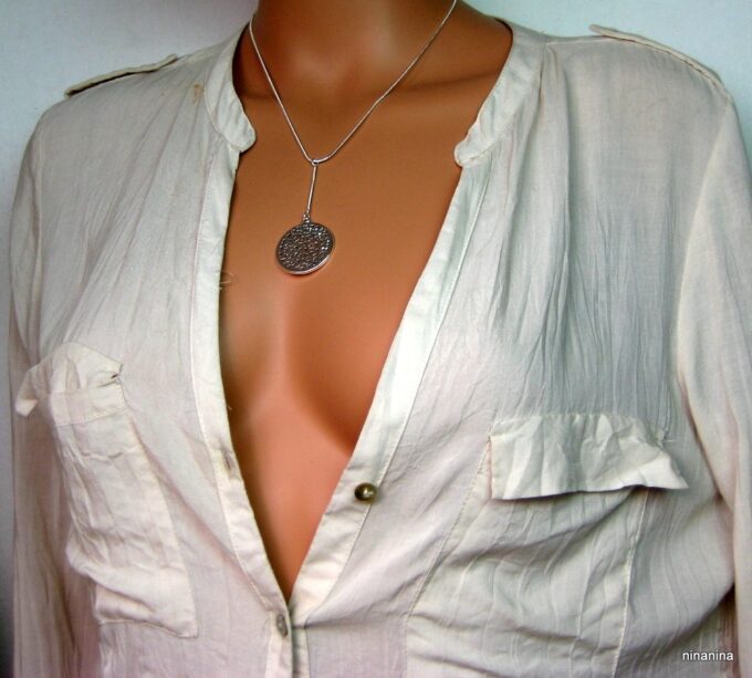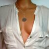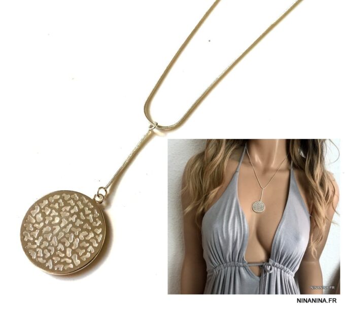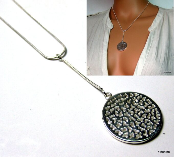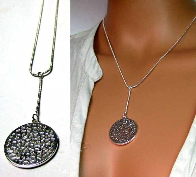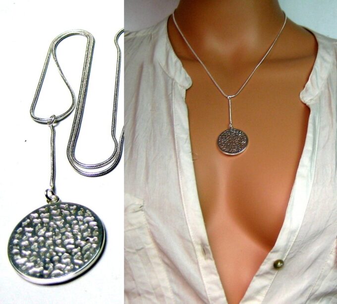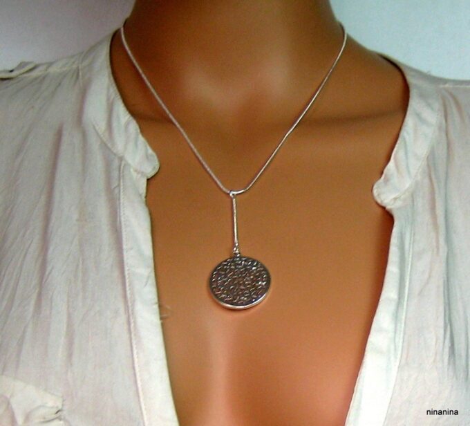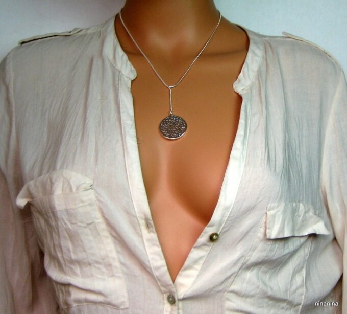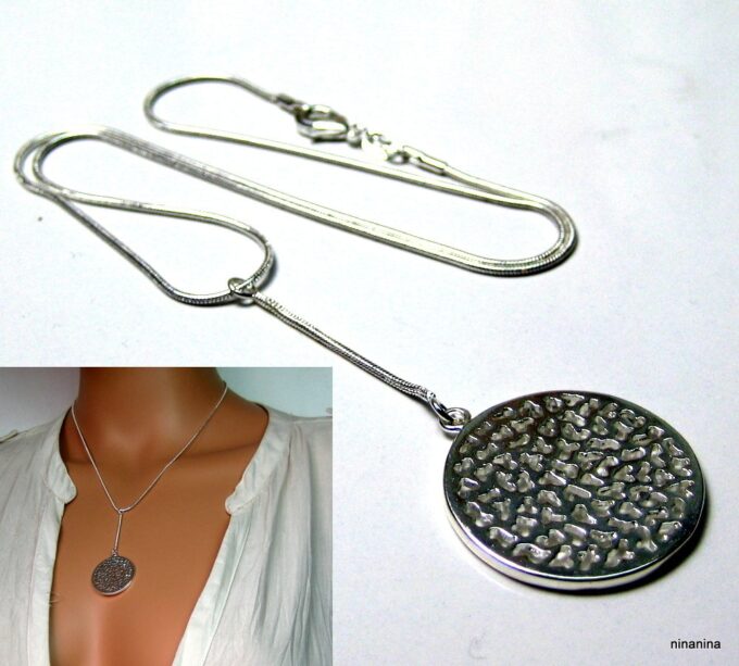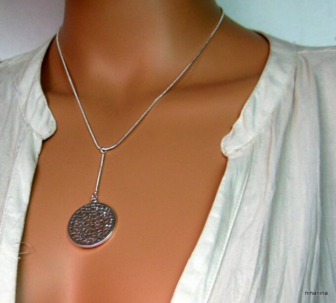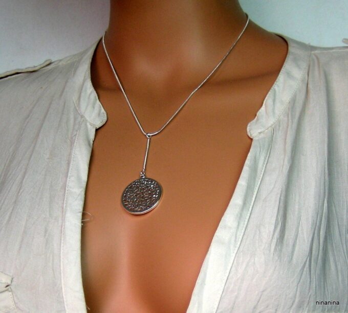 CCollier cravate pendentif rond plaqué Argent composé d’un pendentif rond filigrané en plaqué argent monté sur chainette serpent en plaqué argent (1mm de diamètre).