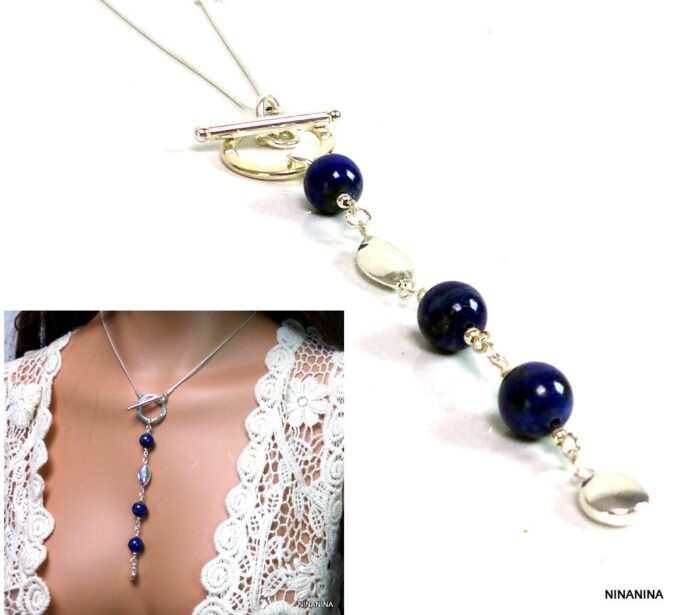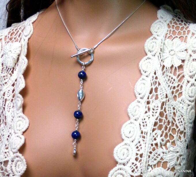 Collier femme Lapis Lazuli argent massif composé de perles en argent 925 et lapis lazuli montées sur chainette serpent en plaqué argent.