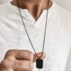Craquez à coup sûr pour ce magnifique Collier Plaque Rectangulaire Militaire Acier Noir ! Long de 70 cm, il est composé d’un pendentif rectangulaire en Acier inoxydable noir monté sur une chaine maille boule en Acier chirurgical.