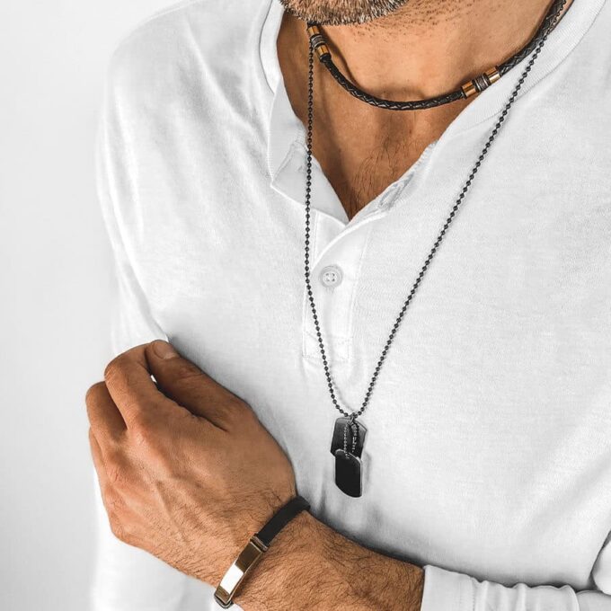 Un collier pour hommes au design aussi sobre qu’élégant présenté avec 2 types de maillons de chaine et deux modèles au choix (pendentif simple ou double). Un pendentif ou deux, chaine maille boule ou forçat, à vous de choisir ! Il se termine par un fermoir mousqueton en acier inoxydable, sûr et facile d’utilisation.