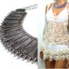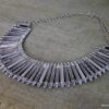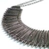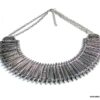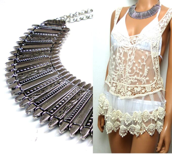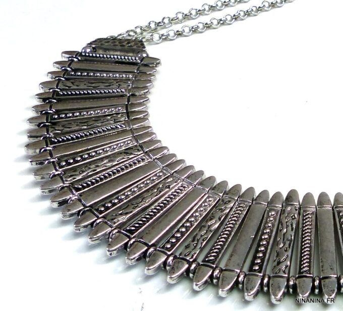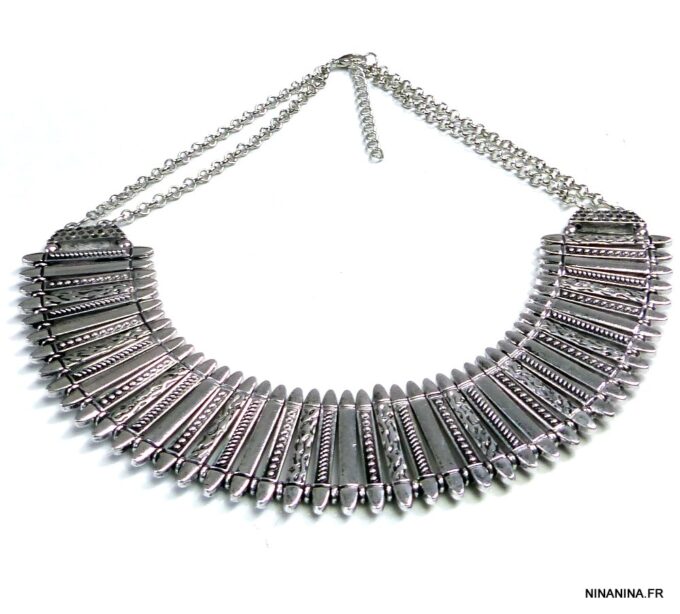 Collier plastron métal argenté composé d’une demi-lune en métal argenté montés sur chaine en métal argenté. Dim de la demi-lune : 21 x 9 cm. Longueur (fermoir compris) : 45 cm environ. Longueur du pendant : 3,5 cm. Fermoir mousqueton et chainette de rallongement. Existe aussi en métal doré. Livré dans sa pochette d’organza.