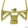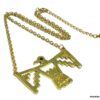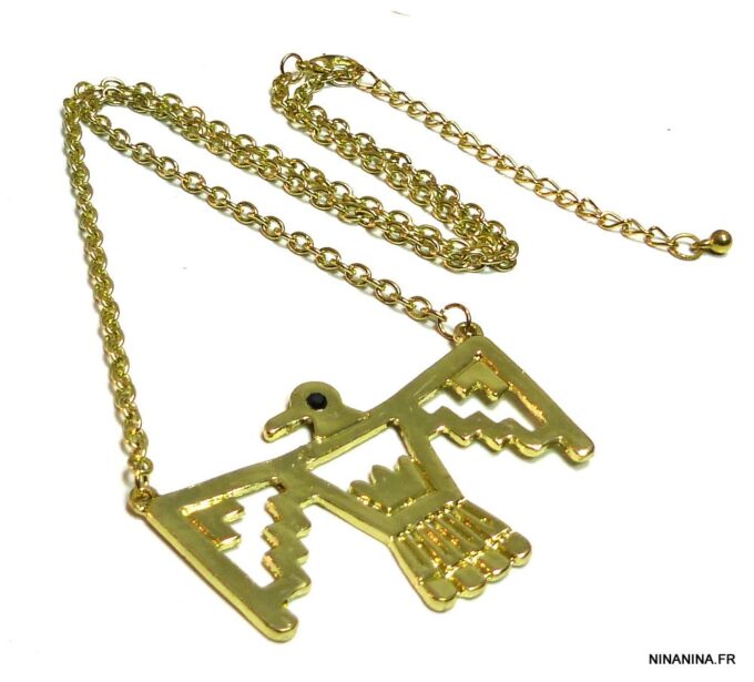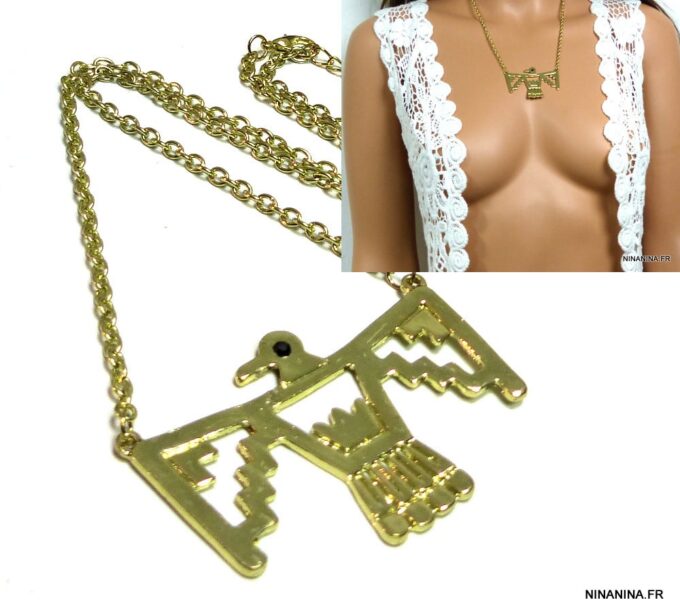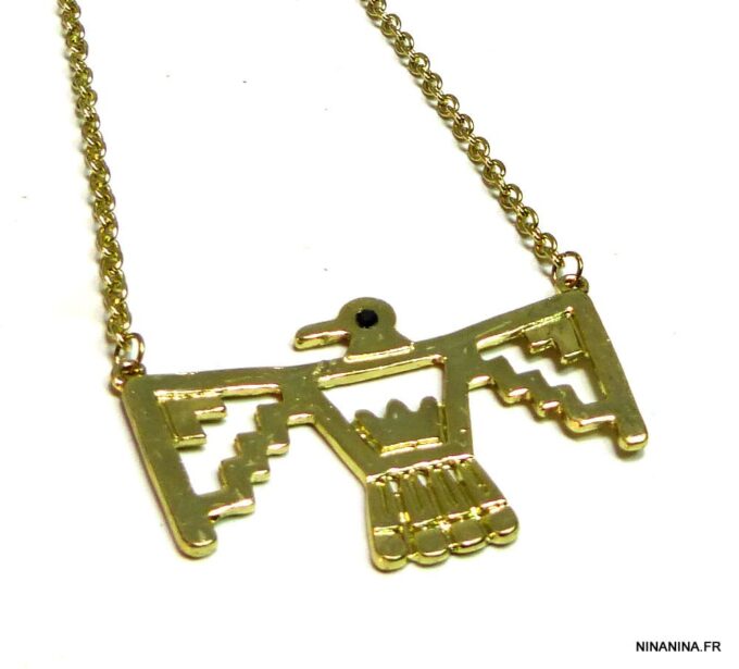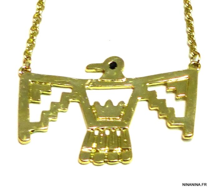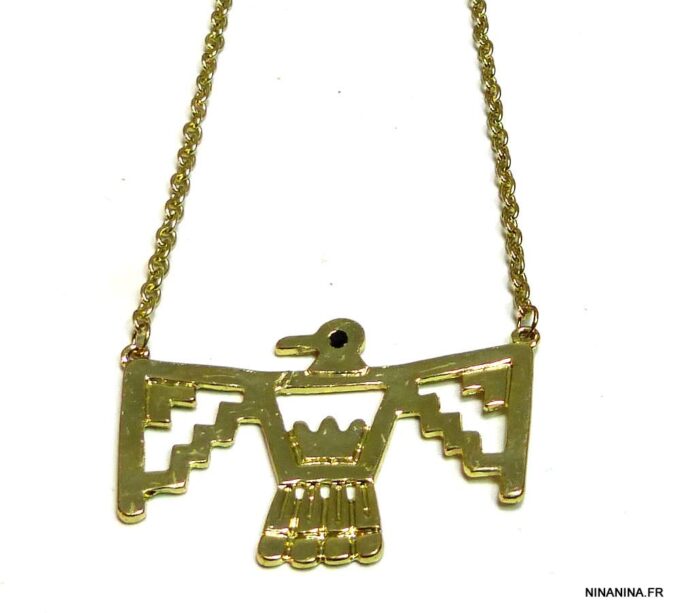 Collier plastron oiseau métal doré. Dim du pendentif : 5,5 X 4 cm. Longueur : 53 cm. Fermoir mousqueton et chainette de rallongement. Livré dans sa pochette d’organza.