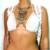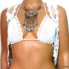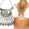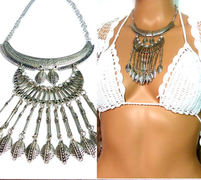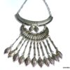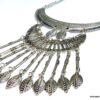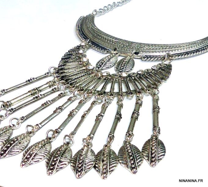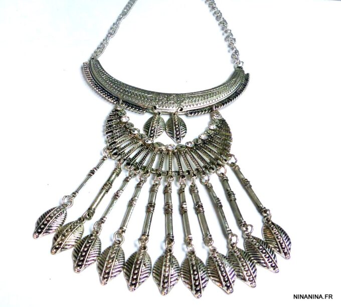 Collier plastron pampilles métal argenté composé de pampilles en métal argenté et boucles d’oreilles assorties montées sur une demi-lune en métal argenté. Dim du pendant : 18 x 7 cm. Longueur (fermoir compris) : 45 cm environ. Fermoir mousqueton et chainette de rallongement. Livré dans sa pochette d’organza.