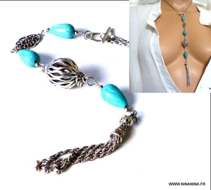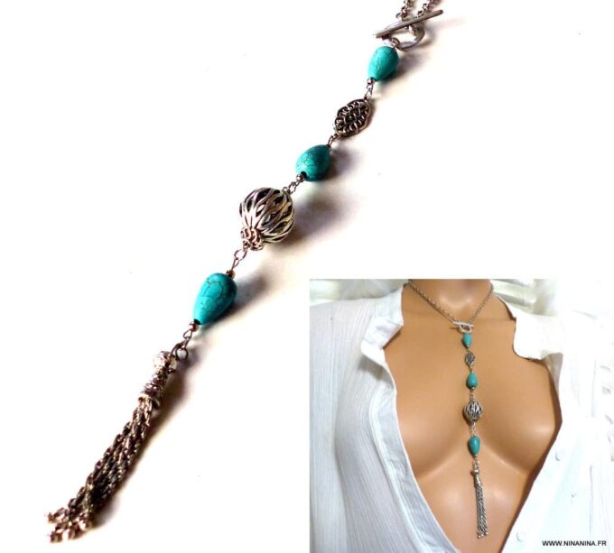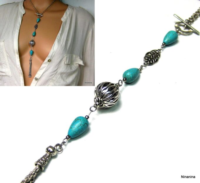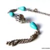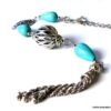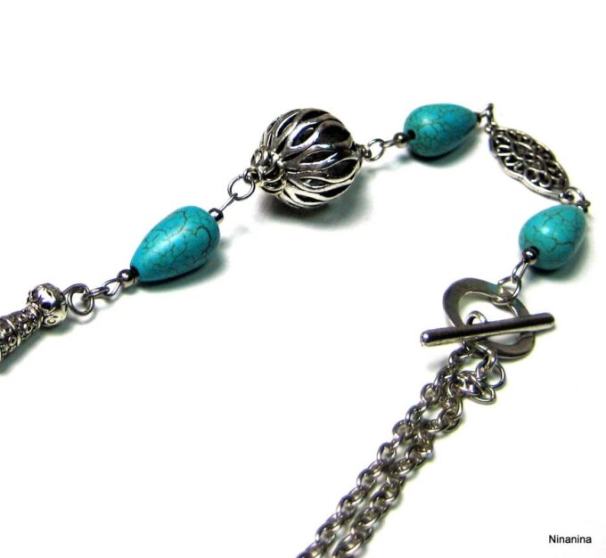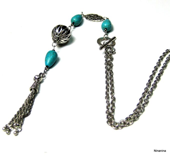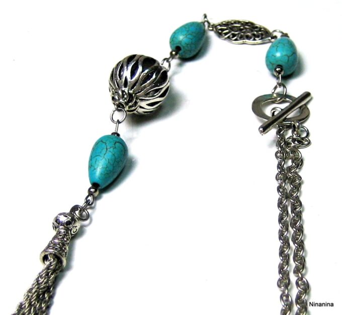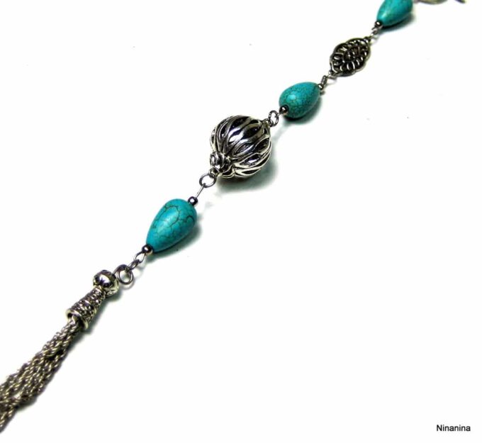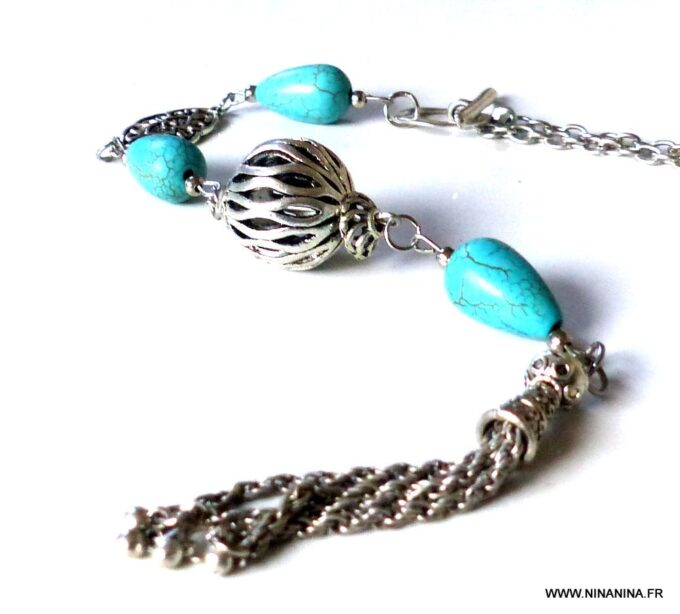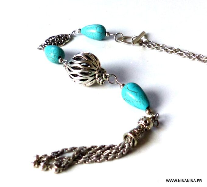 Collier pompon métal argenté et gouttes turquoises composé de gouttes en magnésite turquoise et de perles en métal argenté montées sur chaine maillons ovales et terminé par un pompon en métal argenté.