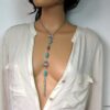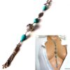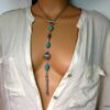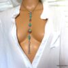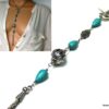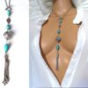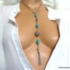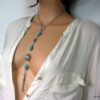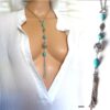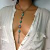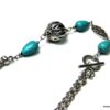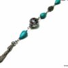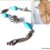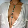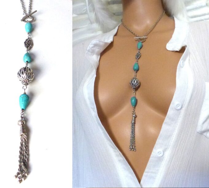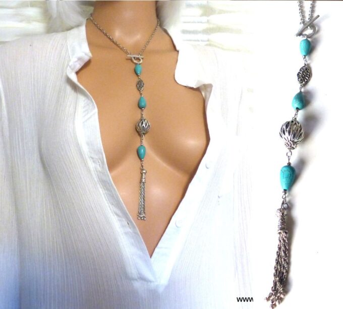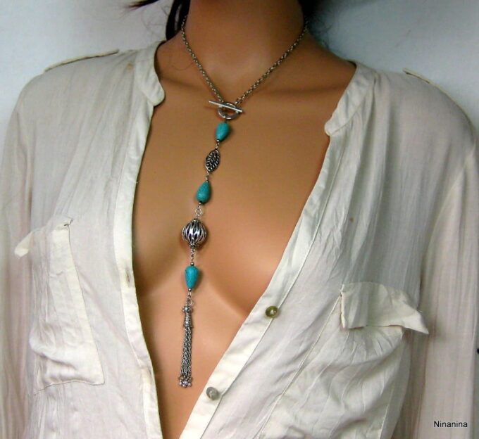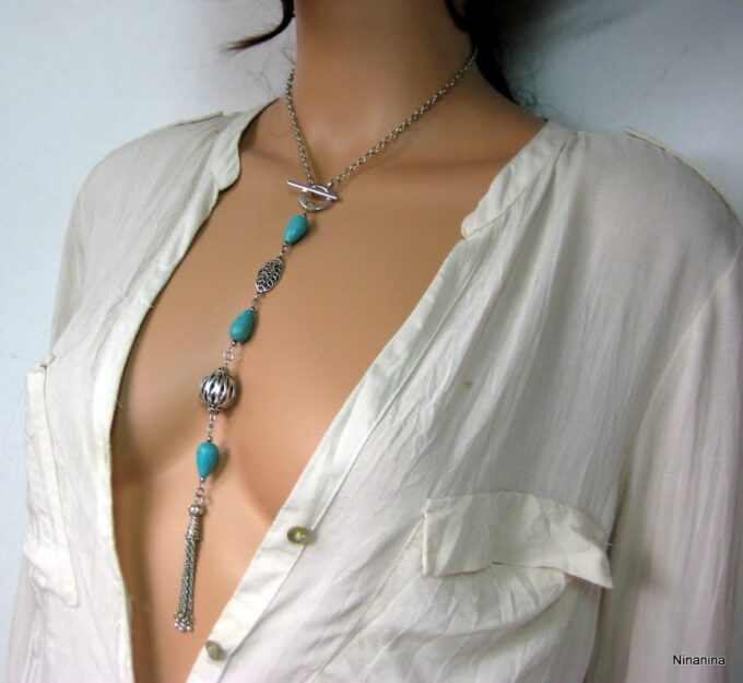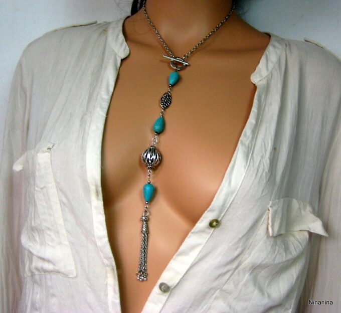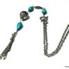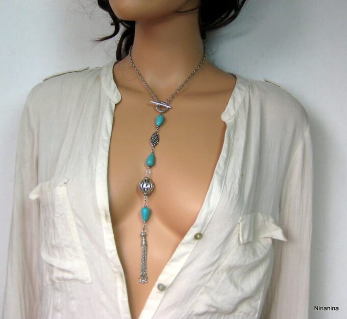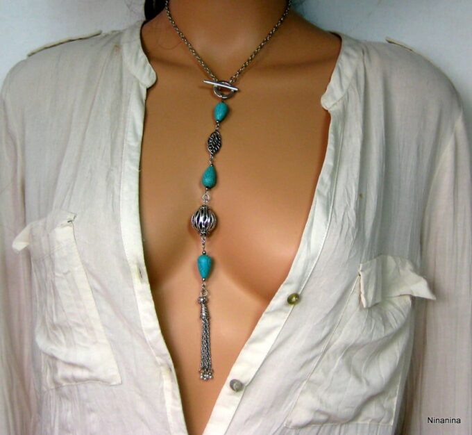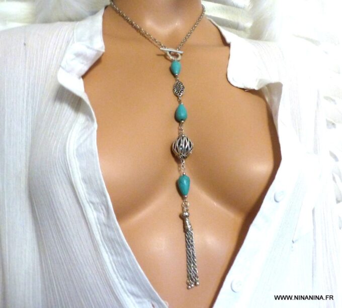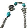 Collier pompon métal argenté et gouttes turquoises composé de gouttes en magnésite turquoise et de perles en métal argenté montées sur chaine maillons ovales et terminé par un pompon en métal argenté.