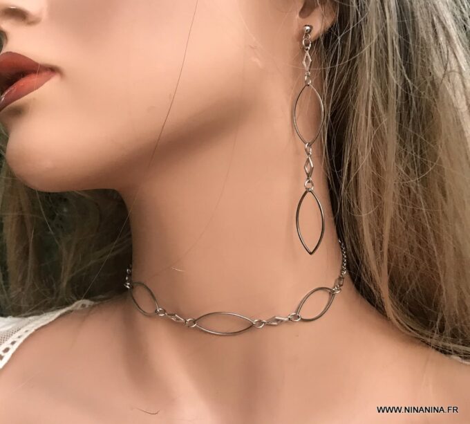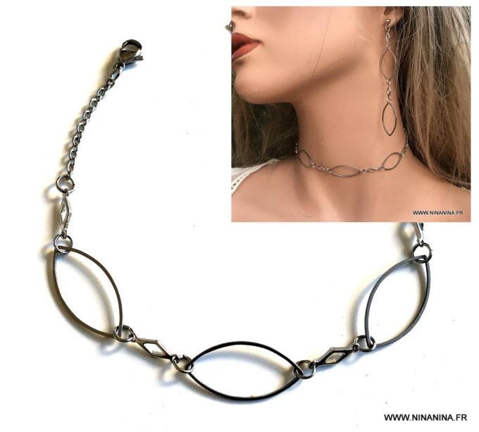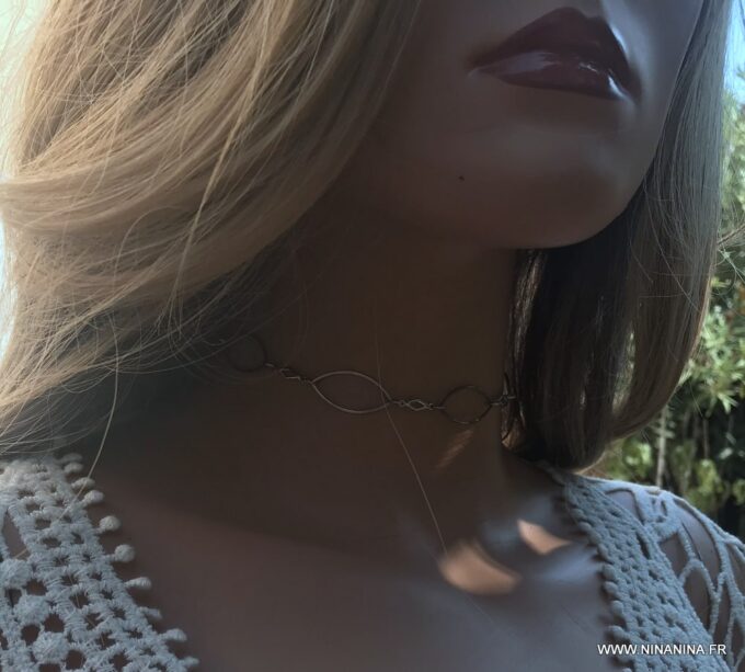 Ce ras de cou en acier inoxydable de grande qualité est unique et fabriqué à la main, de façon artisanale dans notre atelier en France. Il s’agit d’une pièce faite sur mesure de 35 cm de long terminée par un fermoir mousqueton facile d’utilisation et d’une chainette de réglage. Disponible également en acier doré si vous préférez les Bijoux dorés.