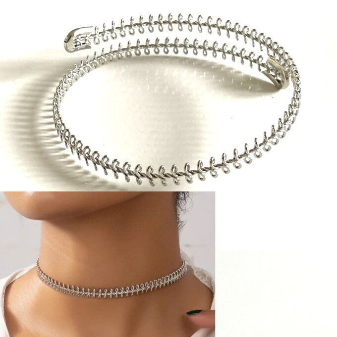 Ce collier torque large de 10 mm avec sa jolie maille fantaisie, épousera parfaitement la forme de votre cou et saura vous mettre en valeur à lui seul ou au soutien d’un pendentif volumineux. A porter seul ou accompagnés d’autres colliers fantaisie.
