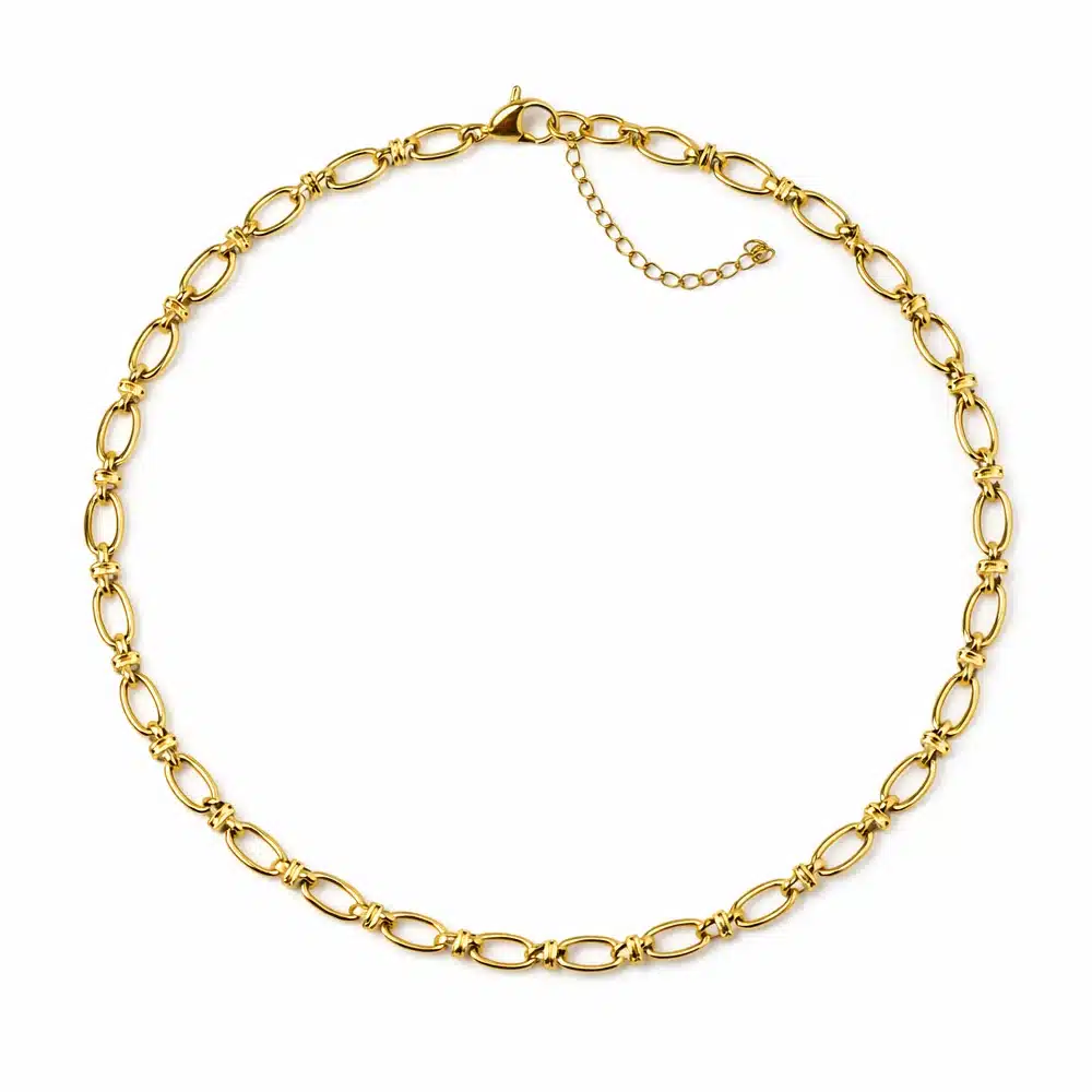 Ce collier ras-de-cou femme en acier doré incarne l’élégance minimaliste par excellence. Conçu avec une maille ovale délicate, il épouse naturellement la ligne du cou et sublime le décolleté avec finesse et modernité.