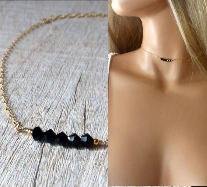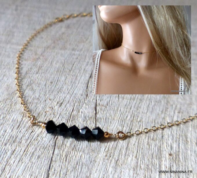 Splendide, délicat et raffiné, ce Collier ras du cou Swarovski plaqué or et perles noires apportera douceur et lumière à votre decolleté. Il composé de perles noires en cristal de Swarovski véritable montées sur une chaine délicate en plaqué or 14 carats gold filled. Un fermoir rond à ressort sûr et facile d’utilisation et une chainette d’ajustement terminent magnifiquement ce bijou swarovski. Un ras de cou femme très original qui délivre toute sa finesse, et vous fera tout simplement craquer !