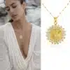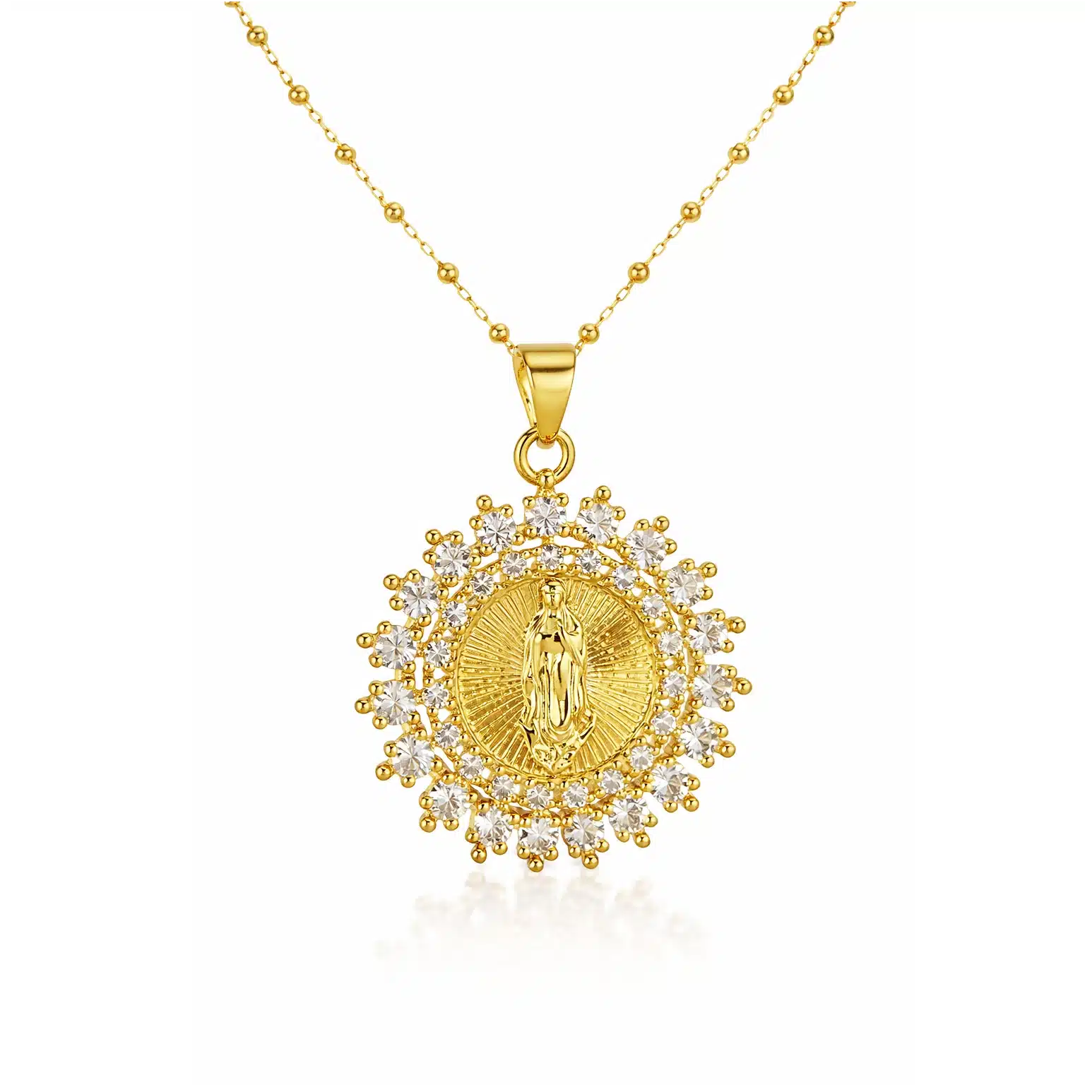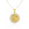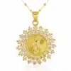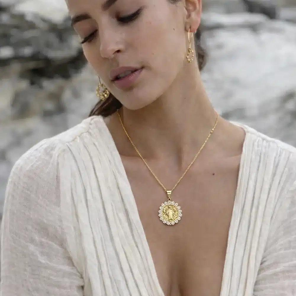 La médaille est délicatement ornée de strass scintillants, qui apportent une touche lumineuse et raffinée au bijou. Sa finition dorée offre un rendu précieux et intemporel, parfait pour sublimer le décolleté avec discrétion.