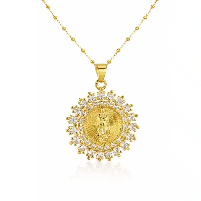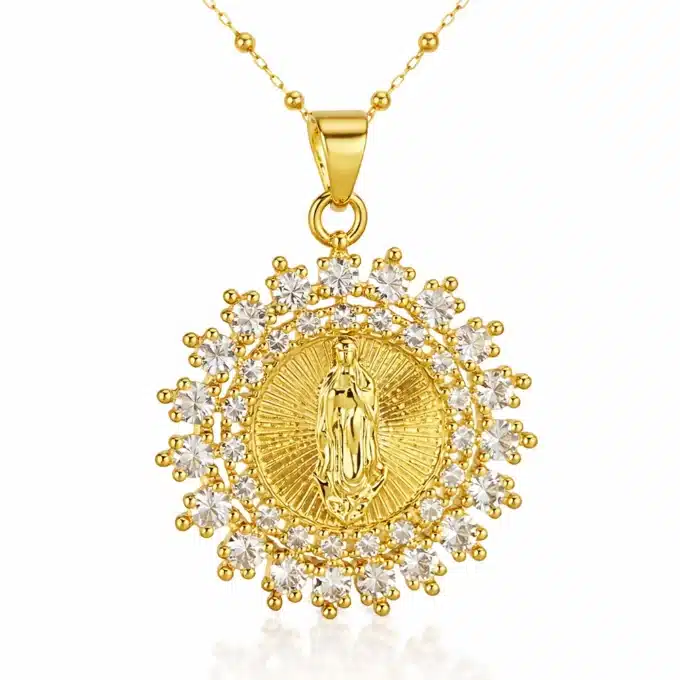 Ce collier religieux pour femme est un bijou spirituel et élégant, conçu pour allier foi, symbolique et esthétique. Il se compose d’une médaille ronde représentant la Vierge Marie, finement travaillée, montée sur une chaînette dorée en acier inoxydable pour une excellente durabilité.