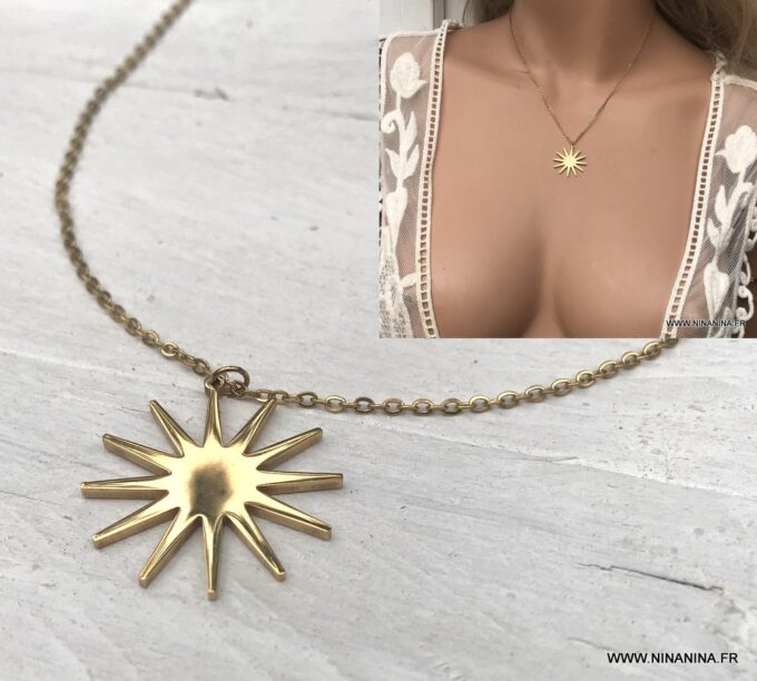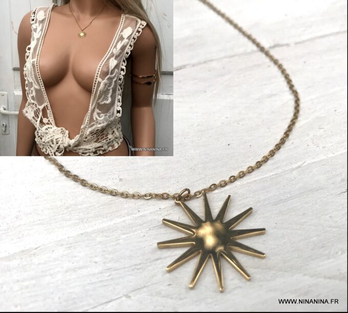 Ce Collier soleil doré en acier inoxydable de grande qualité est unique et fabriqué à la main, de façon artisanale dans notre atelier en France. Il s’agit d’une pièce faite sur mesure de 45 cm de long terminée par un fermoir mousqueton facile d’utilisation.