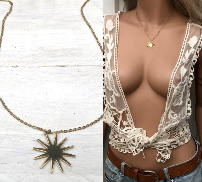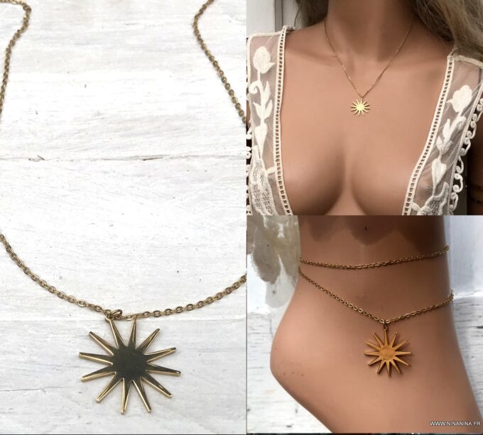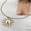 Donnez une subtile touche tendance à votre tenue avec ce sublime Collier soleil doré pour femme en acier inoxydable or et son pendentif original en forme de soleil. Optez pour ce bijou doré hyper tendance et passez un été de rêve !