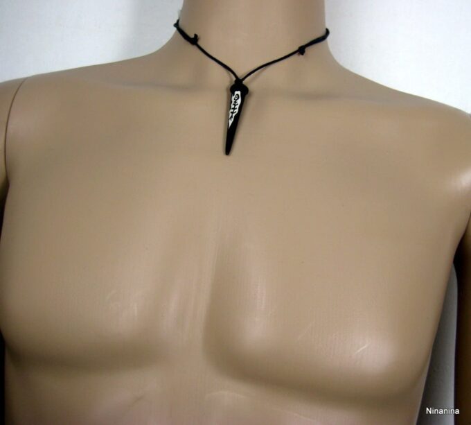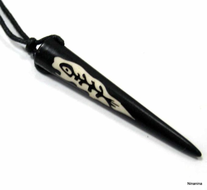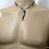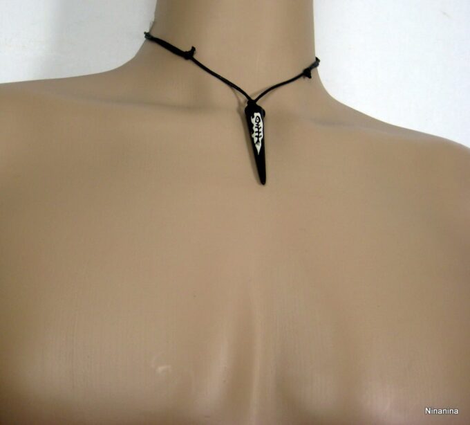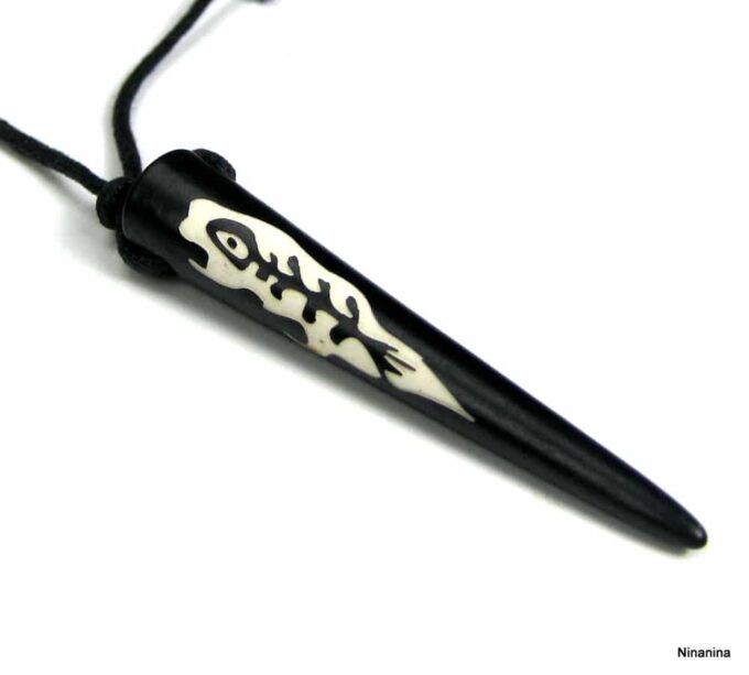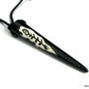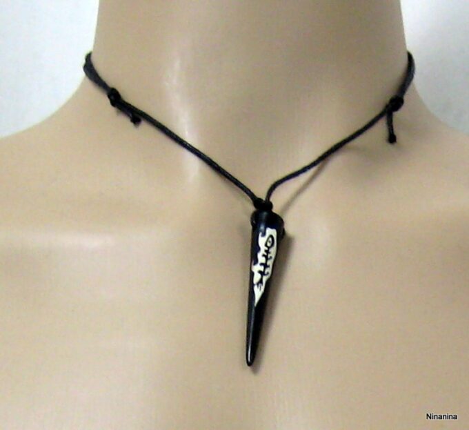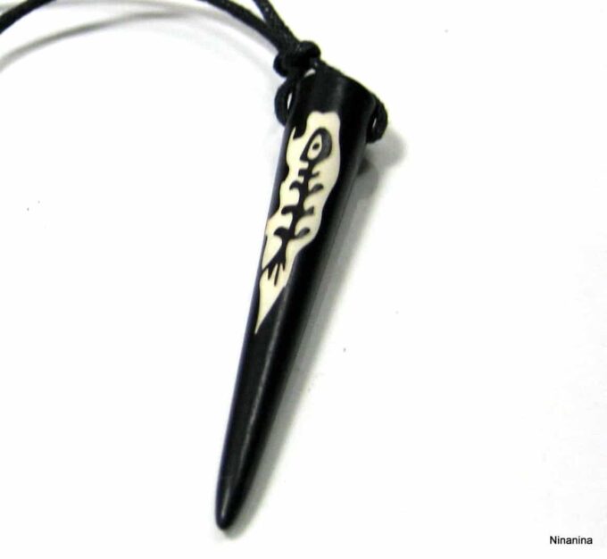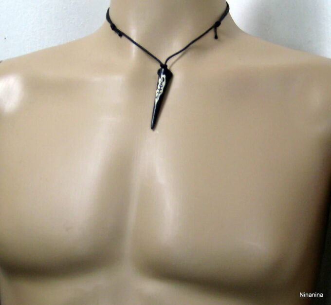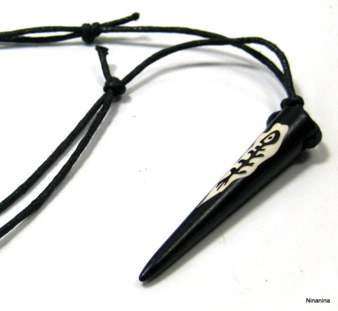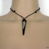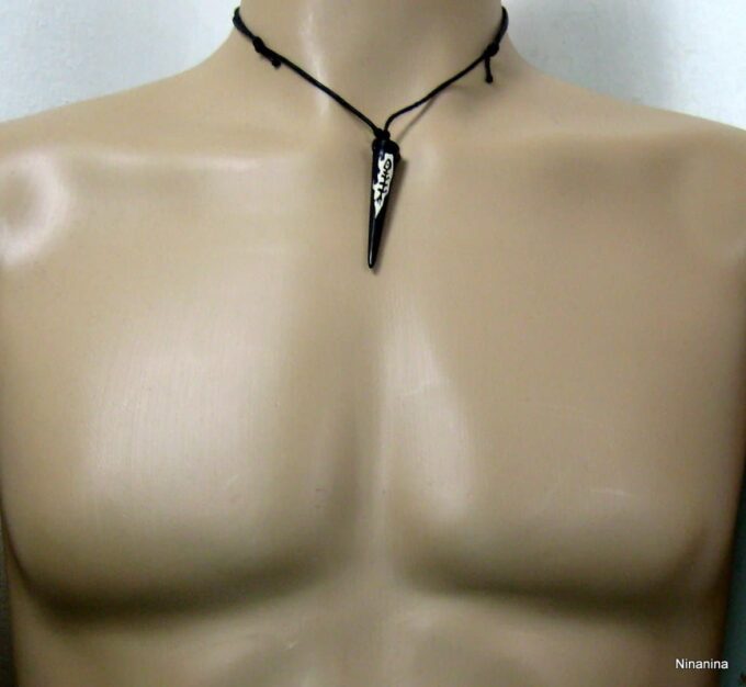 Collier homme surfer bois coton ciré composé d’un pendentif triangulaire en bois noir et écru monté sur un double cordon de coton ciré noir (1,5 mm de diamètre).