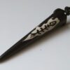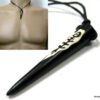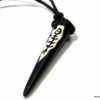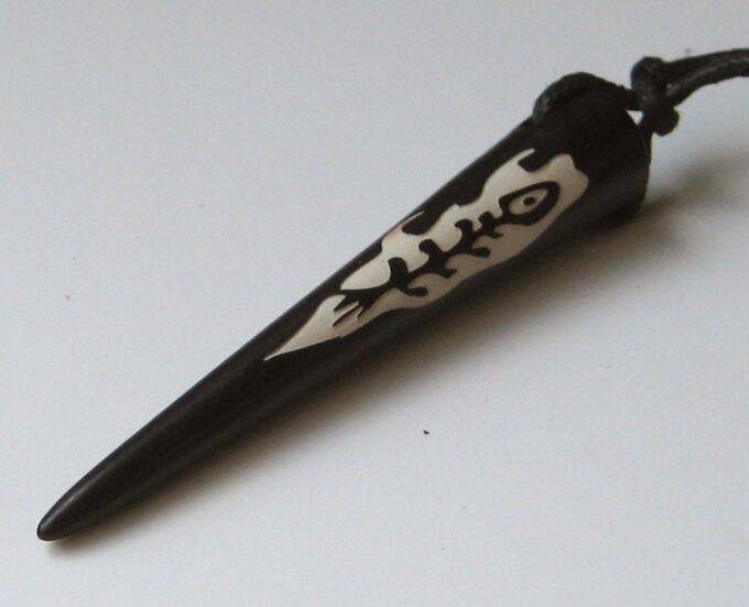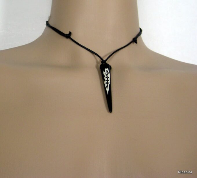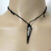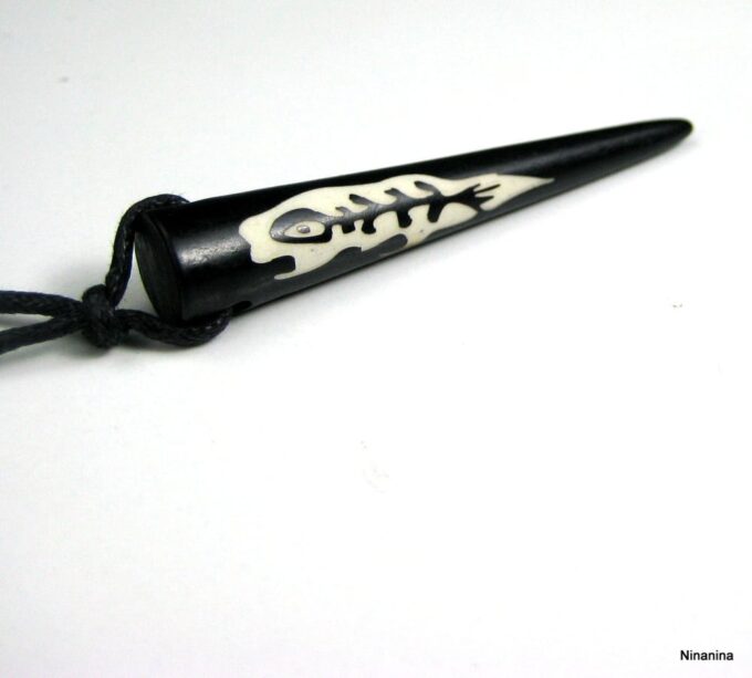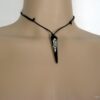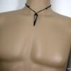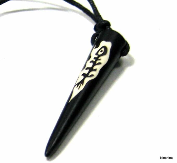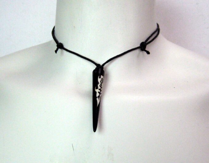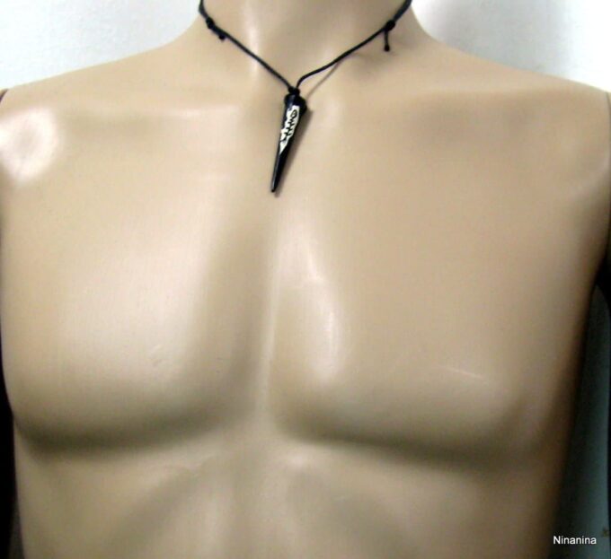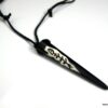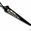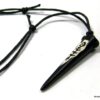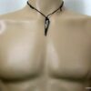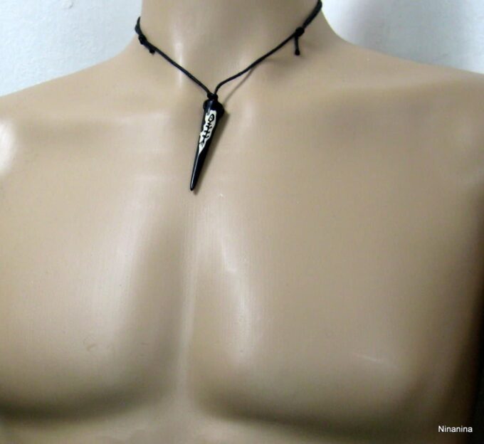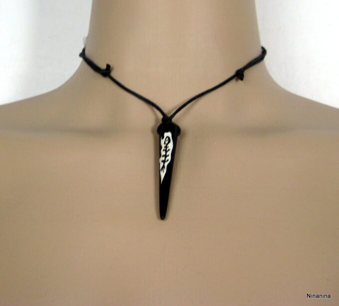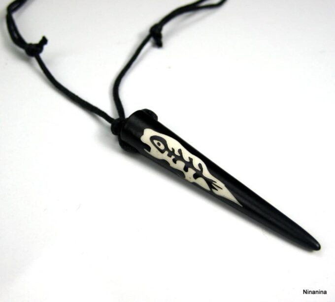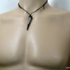 Collier homme surfer bois coton ciré composé d’un pendentif triangulaire en bois noir et écru monté sur un double cordon de coton ciré noir (1,5 mm de diamètre).