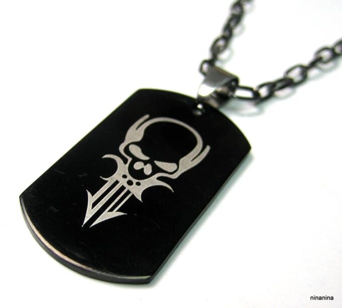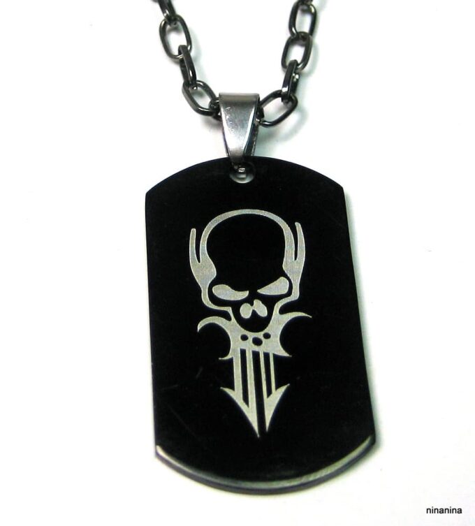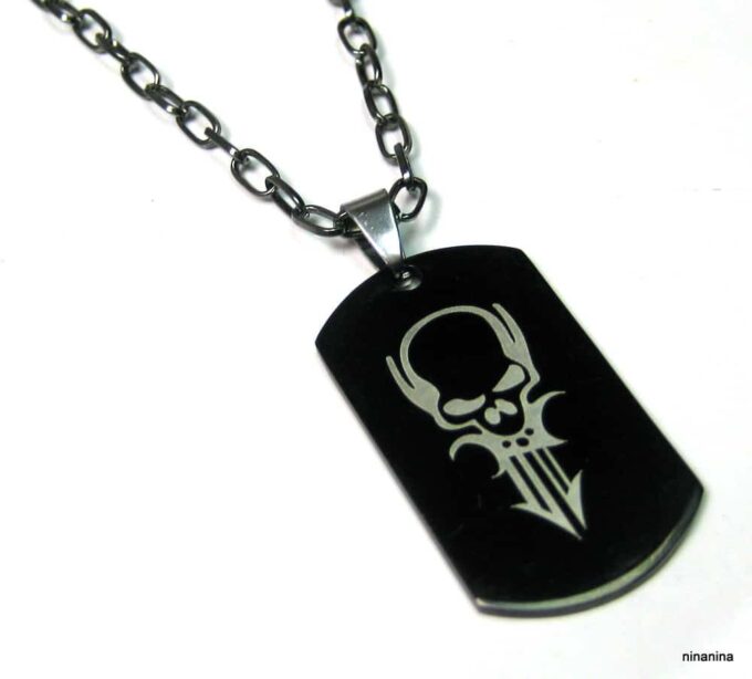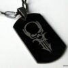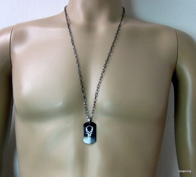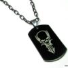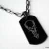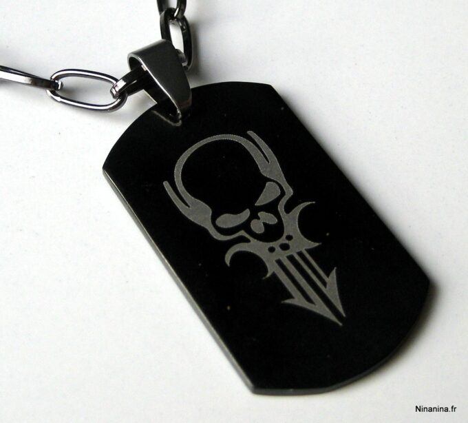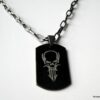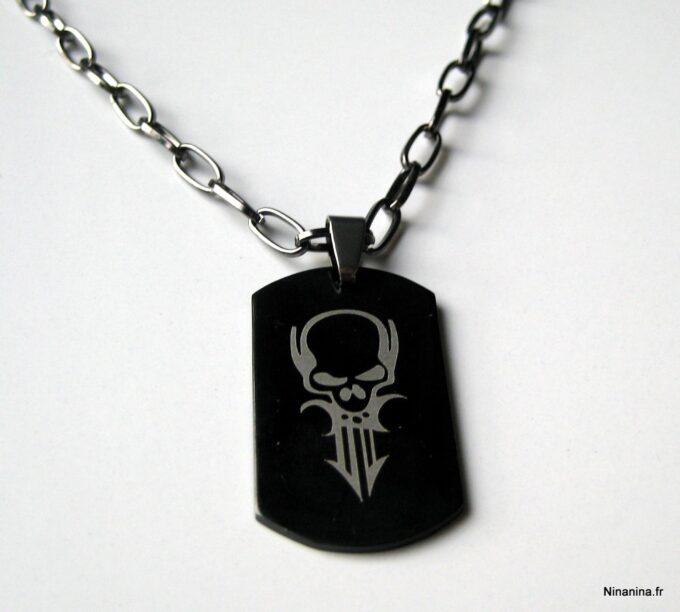 Collier homme tête de mort acier argenté composé d’un pendentif rectangulaire en acier inoxydable noir et argent monté sur une chaine maillons ovales en métal noir.