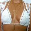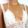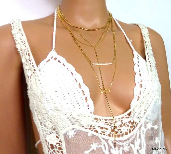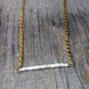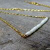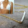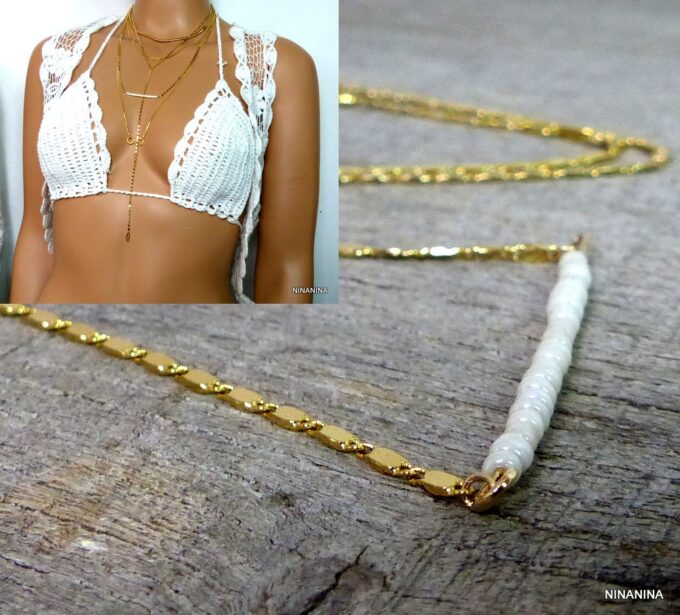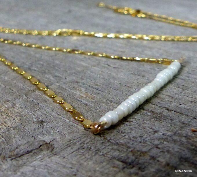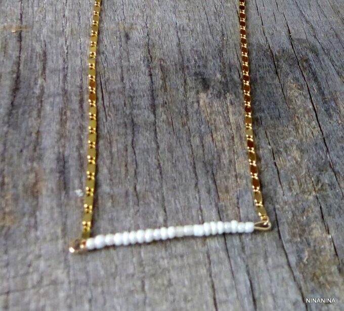 Collier trapèze plaqué or rocaille blanche composé d’une chainette fantaisie en plaqué or 18 carats (largeur : 2 mm) et de rocailles blanches. Fermoir mousqueton. Longueur du collier : 53 cm env. Livré dans sa pochette d’organza. Bijou 100% fait main. Poids : 5 g
