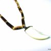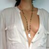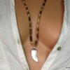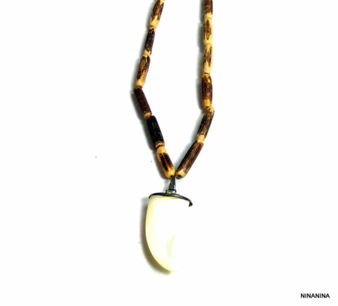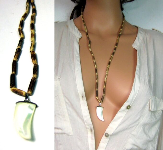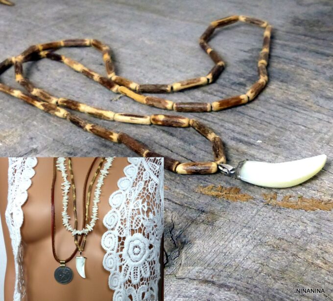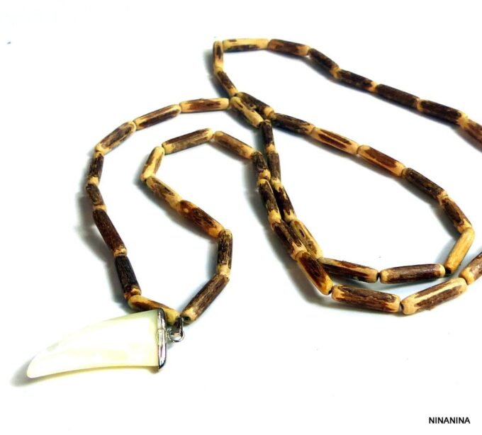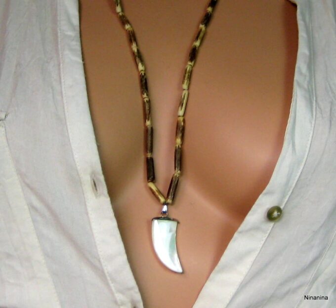 Collier sautoir perles bois tribal dent de requin nacre composé d’un pendentif dent de requin en nacre et de perles de bois cylindriques. Dim du pendentif : 3 x 1,5 cm. Fermoir aimanté cylindrique. Longueur (fermoir compris) : 75 cm env. Livré dans sa pochette d’organza. Bijou 100% fait-main.
