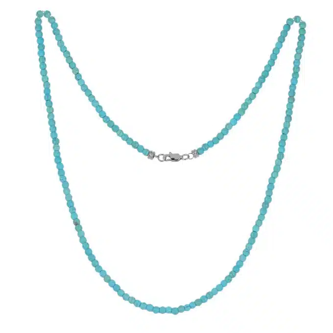 Vous allez craquer pour ce Collier Turquoise homme pierre bleue 4mm Acier ! Il est composé de pierres en Turquoise bleue naturelle de 4mm de diamètre et d’un fermoir mousqueton en acier inoxydable, sûr et facile d’utilisation. Un collier pour hommes au design aussi sobre et élégant que possible visant à mettre les pierres naturelles sur le devant de la scène.