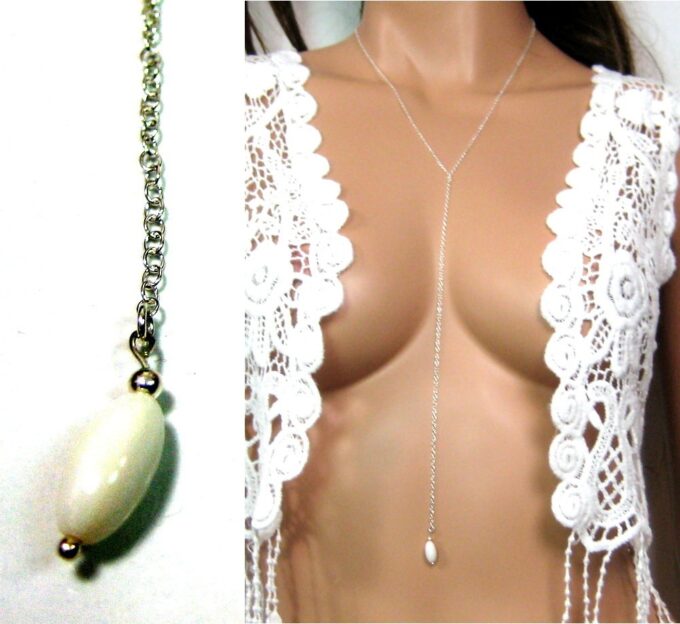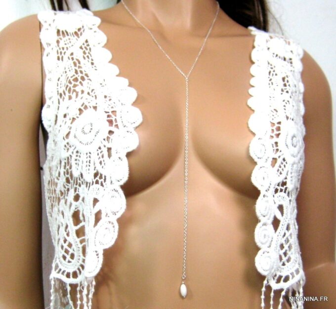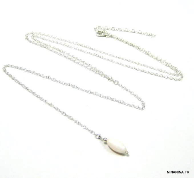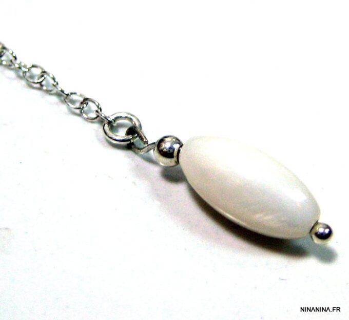Collier « Y » argent massif et goutte nacre composé d’une goutte en nacre blanche montée sur chainette en argent 925. Fermoir mousqueton. Longueur : 50 cm + 20 cm env pendant. Livré dans sa pochette d’organza. Bijou 100% fait-main. Poids : 1,8 g