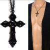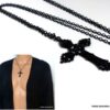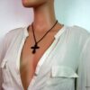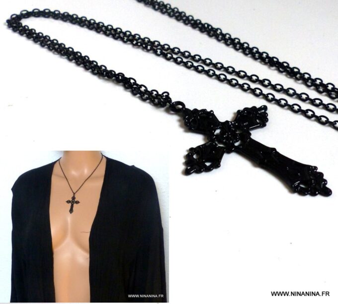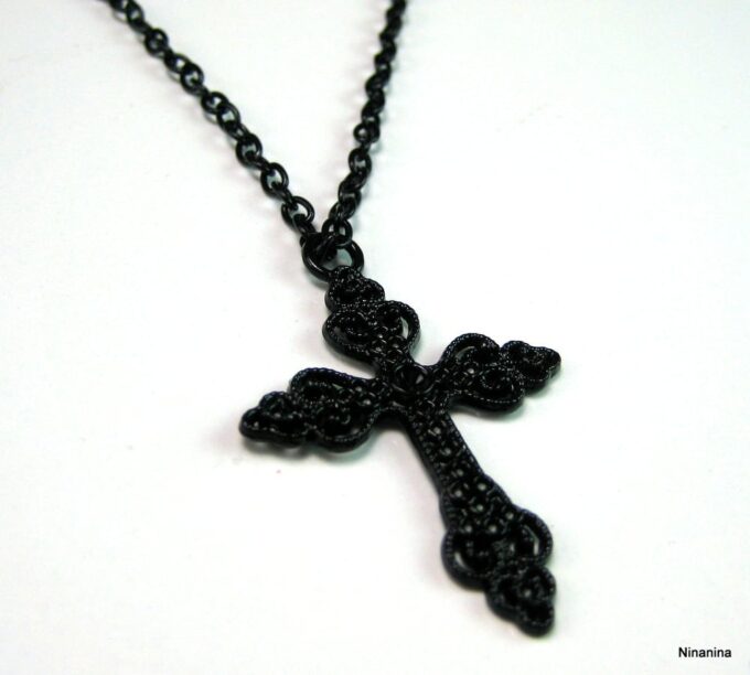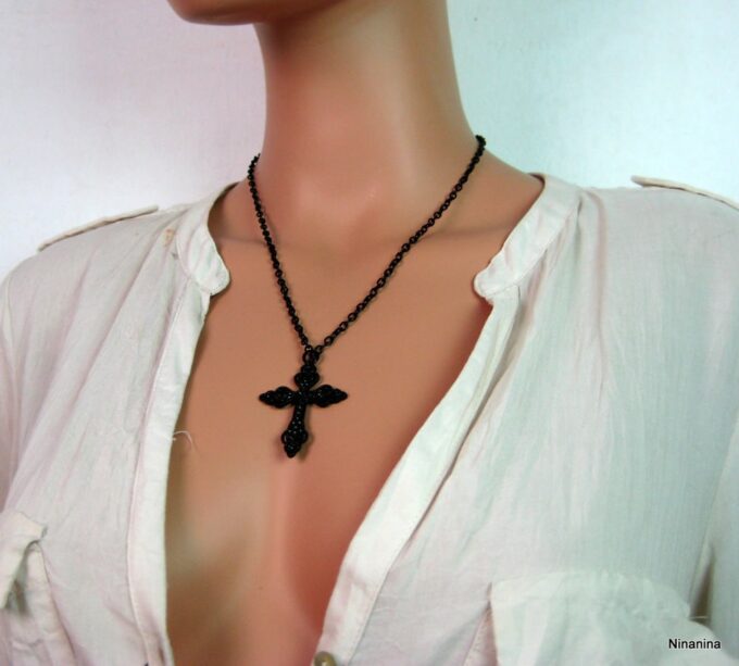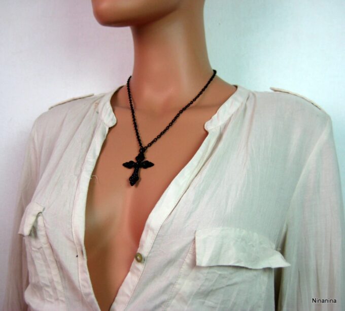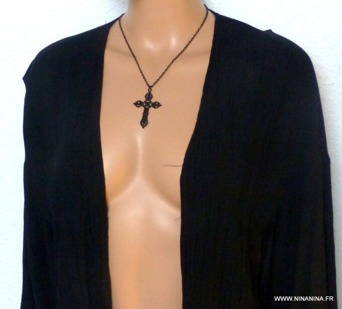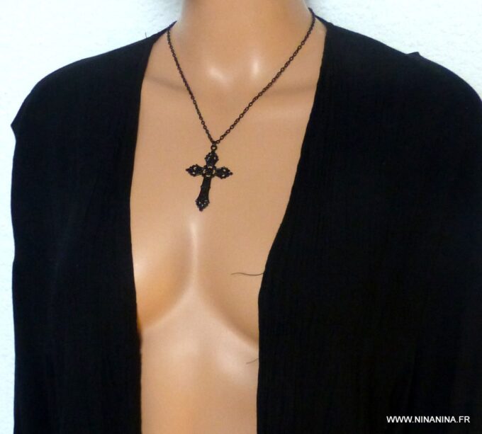 Un collier femme pendentif croix métal noir prêt à offrir!