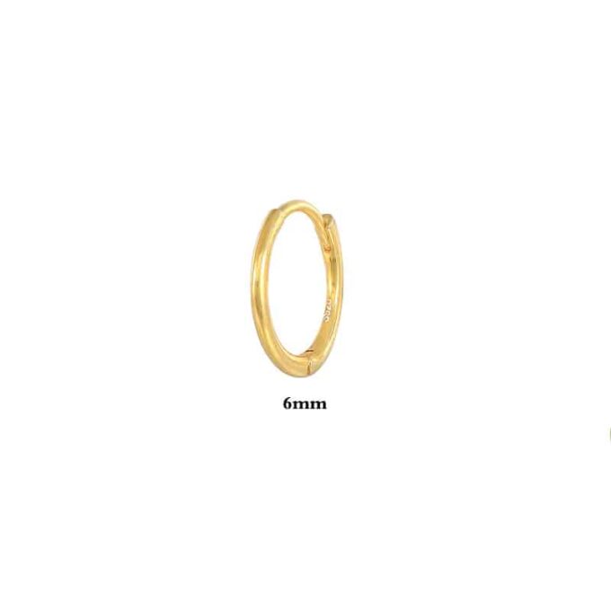 Craquez pour cette mini Creole 6mm or plaqué sur Argent 925 massif, un anneau doré à porter tous les jours, sobre et efficace ! Cette mini créole en Argent 925 plaqué or de 6mm de diamètre vient délicatement entourer le lobe pour un effet minimaliste ou rock.