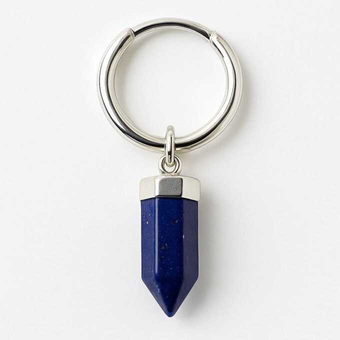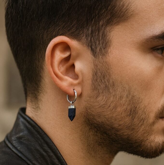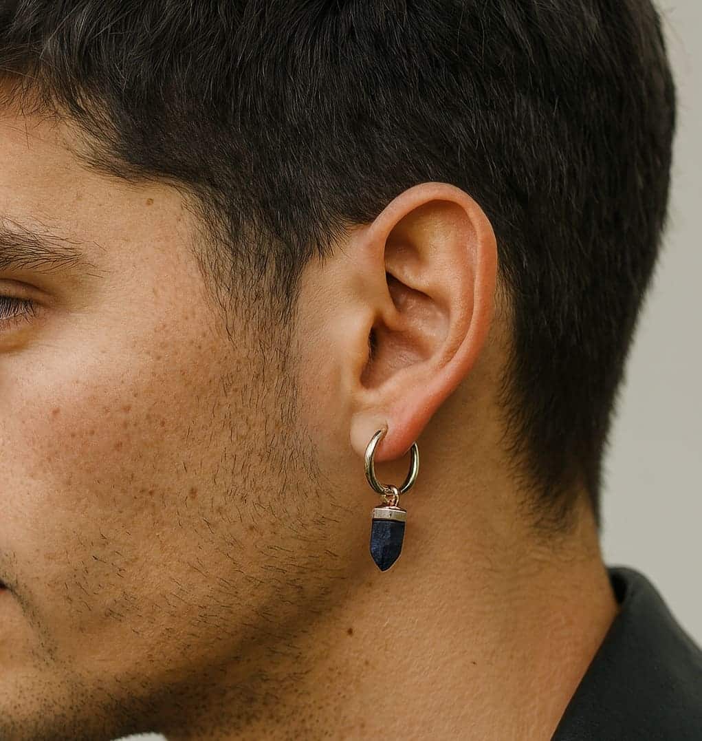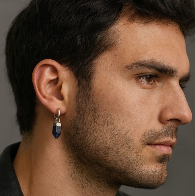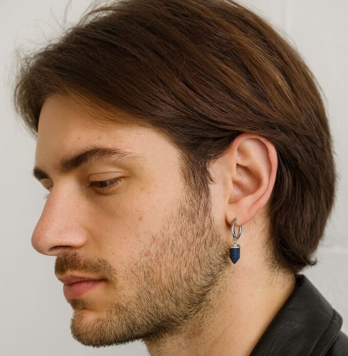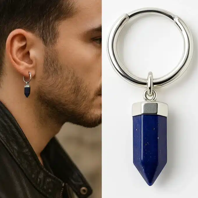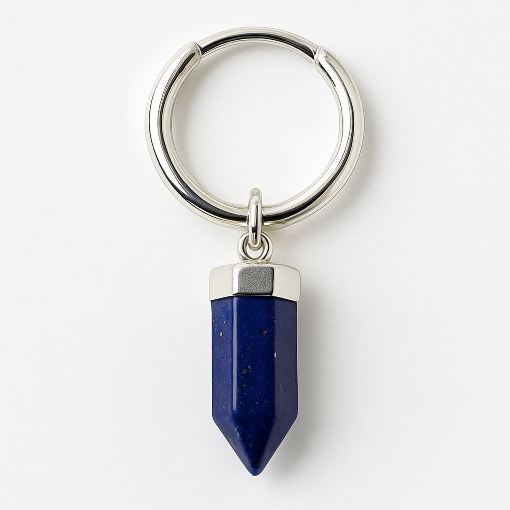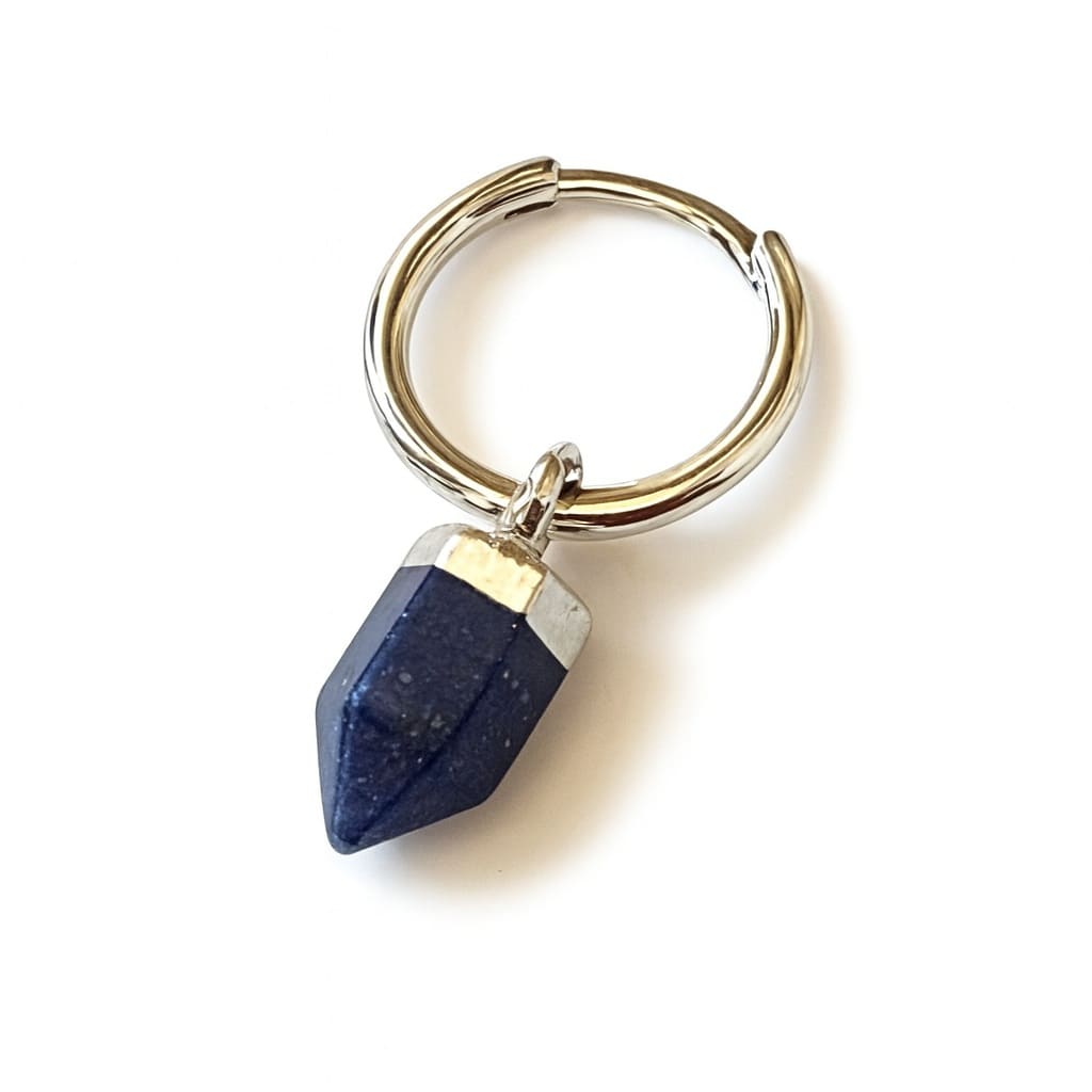 Créole homme en argent 925, ornée d’une pointe de lapis lazuli bleu taillée en pyramide hexagonale. Un bijou artisanal unique, puissant et élégant.