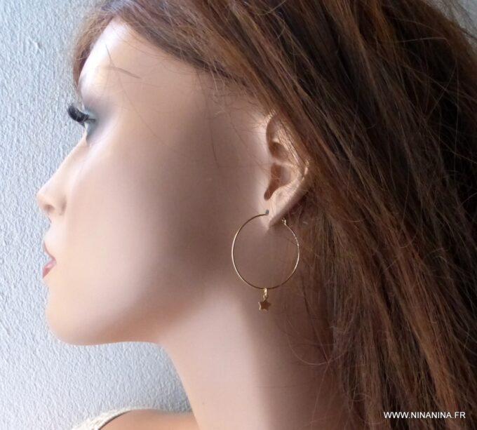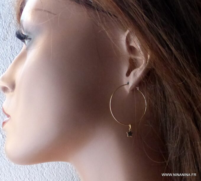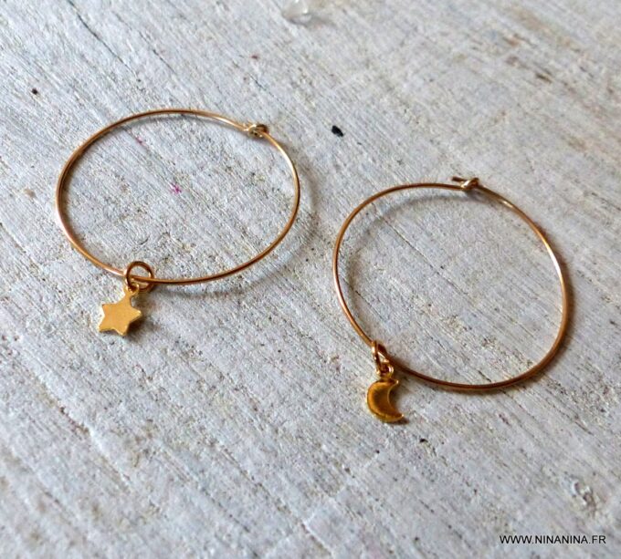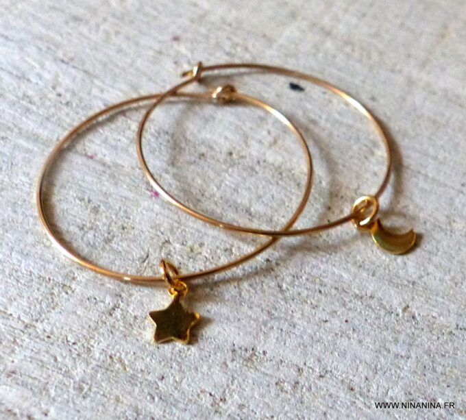 Boucles d’oreilles lune etoile – créoles bohème plaqué Or aux allures bohème, les petites breloques croissant de lune et étoile en plaqué or ajouteront à votre look boho chic une touche celeste!