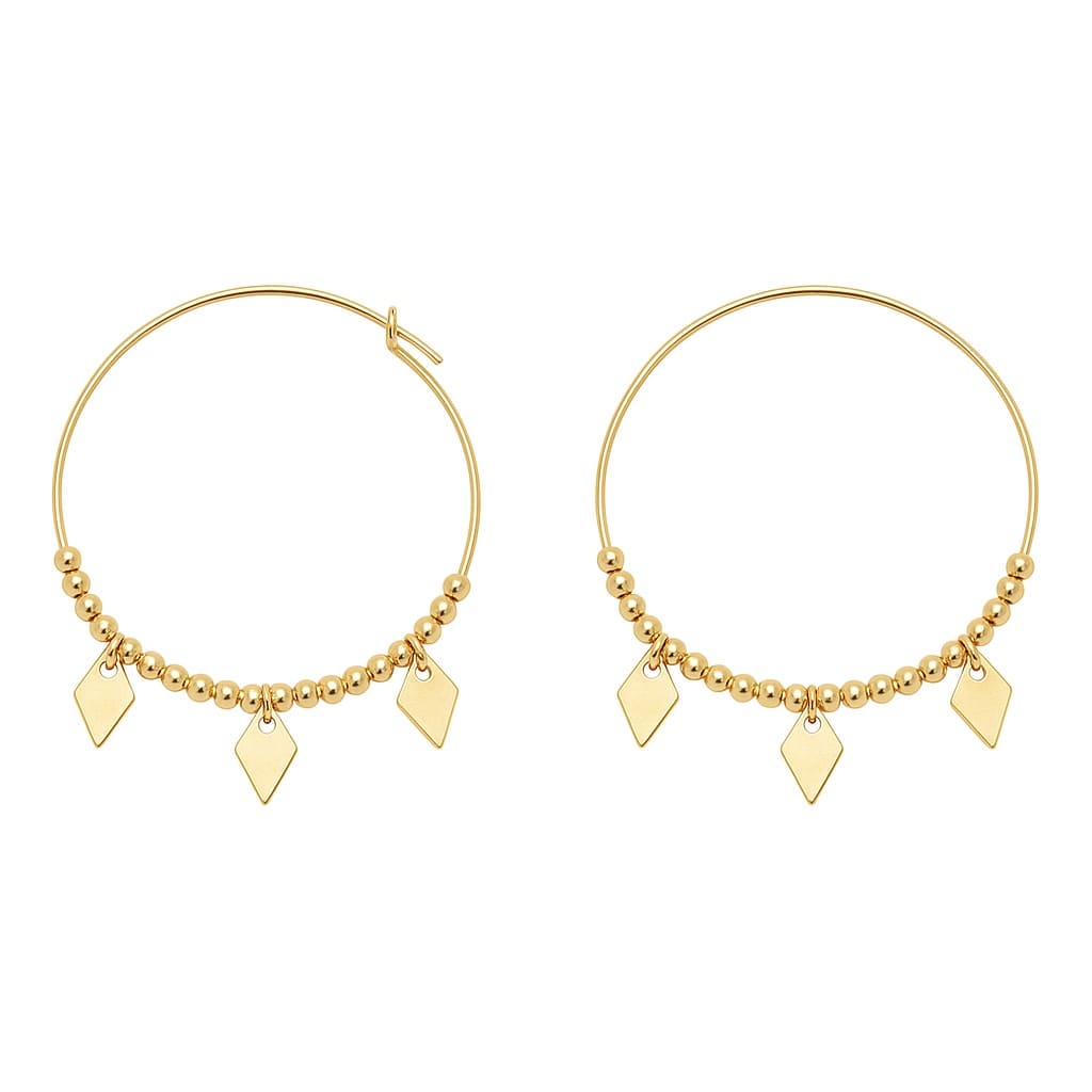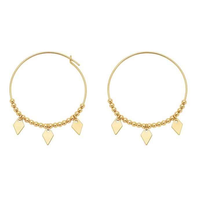 Ces magnifiques créoles en or laminé ornées de petits charms en forme de losange incarnent à la perfection l’esprit bohème chic et raffiné.
