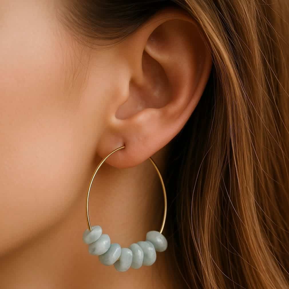 Ces Boucles d’oreilles en plaqué or 14 carats gold filled et Aigue-marine de grande qualité sont uniques et fabriquées à la main, de façon artisanale dans notre atelier en France. Le diamètre des boucles est de 30 mm. Ces boucles d’Oreilles sont également disponibles avec des Turquoises et des Lapis Lazuli.