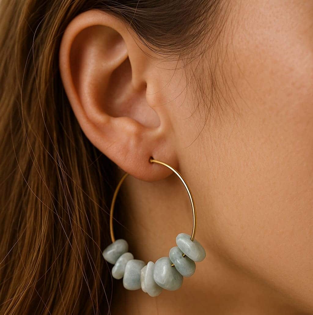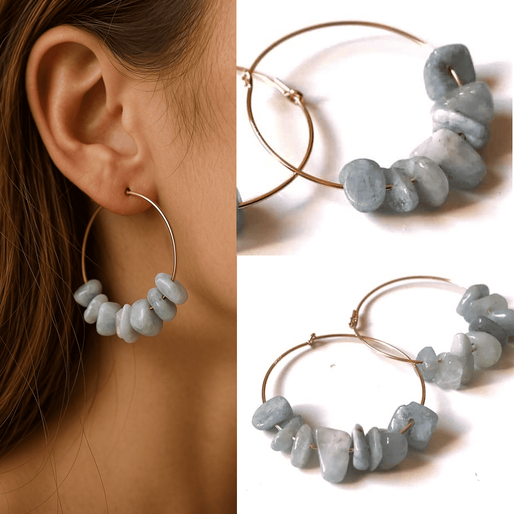 Vous serez séduit(e) pour cette paire de boucles d’oreilles Creoles Bleues Aigue marine naturelle Et Plaqué Or, simple et délicate et ses perles ships en Aigue marine naturelle montées sur une boucle créole ronde en plaqué or 14 carats gold filled.