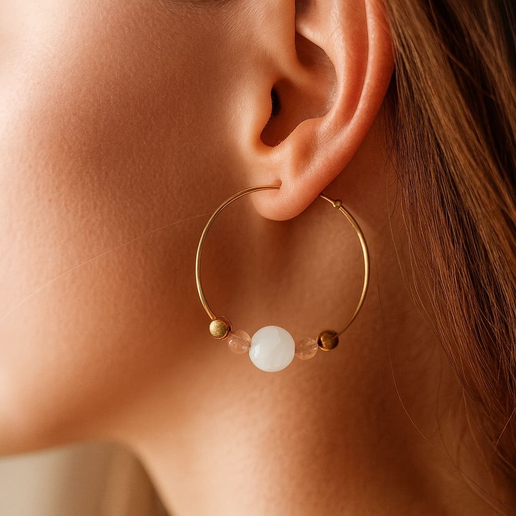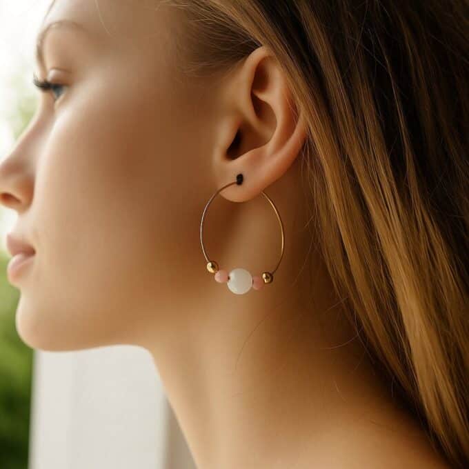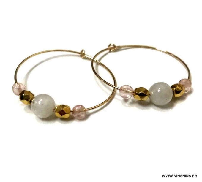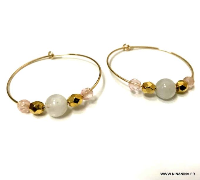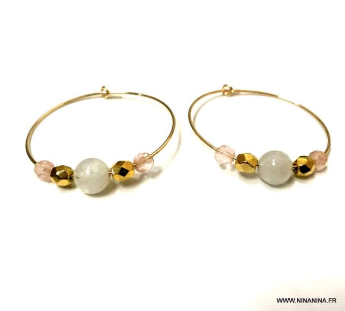 Craquez pour ces magnifiques créoles en pierre de lune et quartz rose!