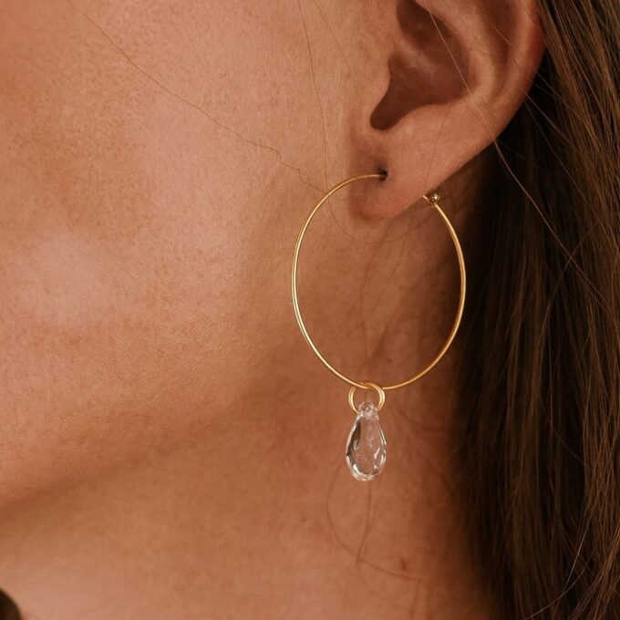 Ces créoles gouttes d’eau en cristal Swarovski incarnent la perfection artisanale : une alliance subtile entre l’éclat du cristal et la douceur du plaqué or.