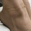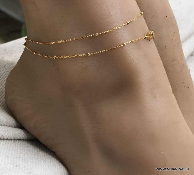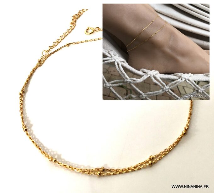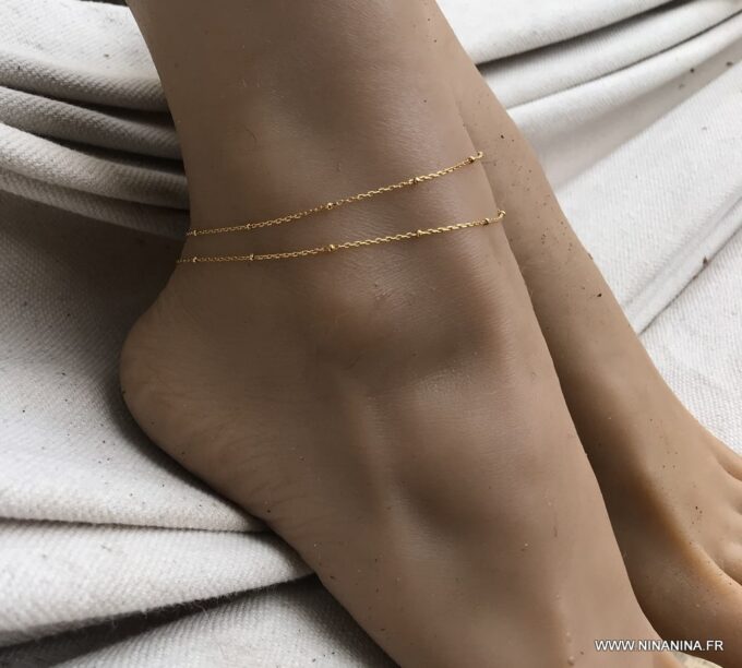 Optez pour cette jolie Double chaîne de cheville plaqué or maille satellite toute simple terminée par un délicat fermoir rond à ressort, sûr et facile d’utilisation, à enrouler autour de la cheville (2 tours).