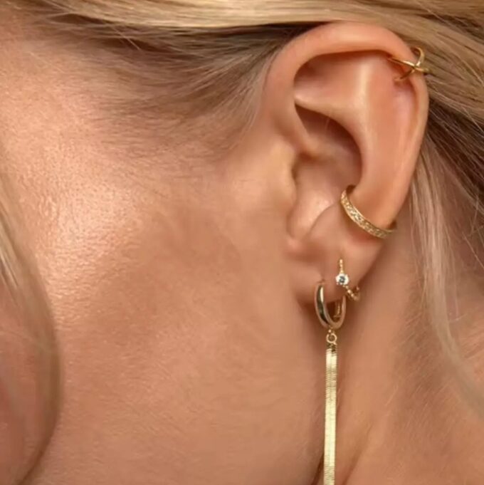 Ce Ear Cuff doré se porte simplement en le glissant sur le bord de l’oreille, puis en le positionnant sur la zone helix ou cartilage.