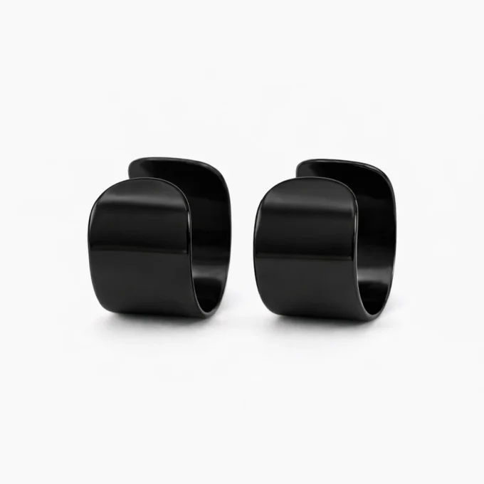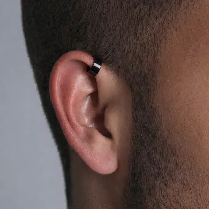 Ear cuff homme large en acier inoxydable noir, conçu pour être porté sans oreille percée. Un bijou masculin moderne, minimaliste et confortable au quotidien.