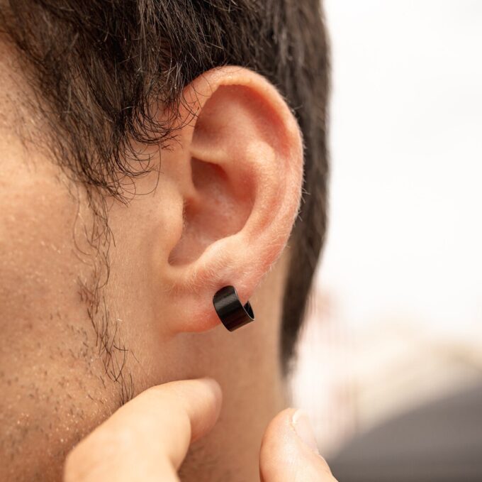 La finition noire mate renforce son caractère masculin et urbain et en fait un bijou d’oreille idéal pour compléter un look minimaliste ou streetwear.