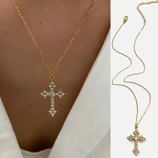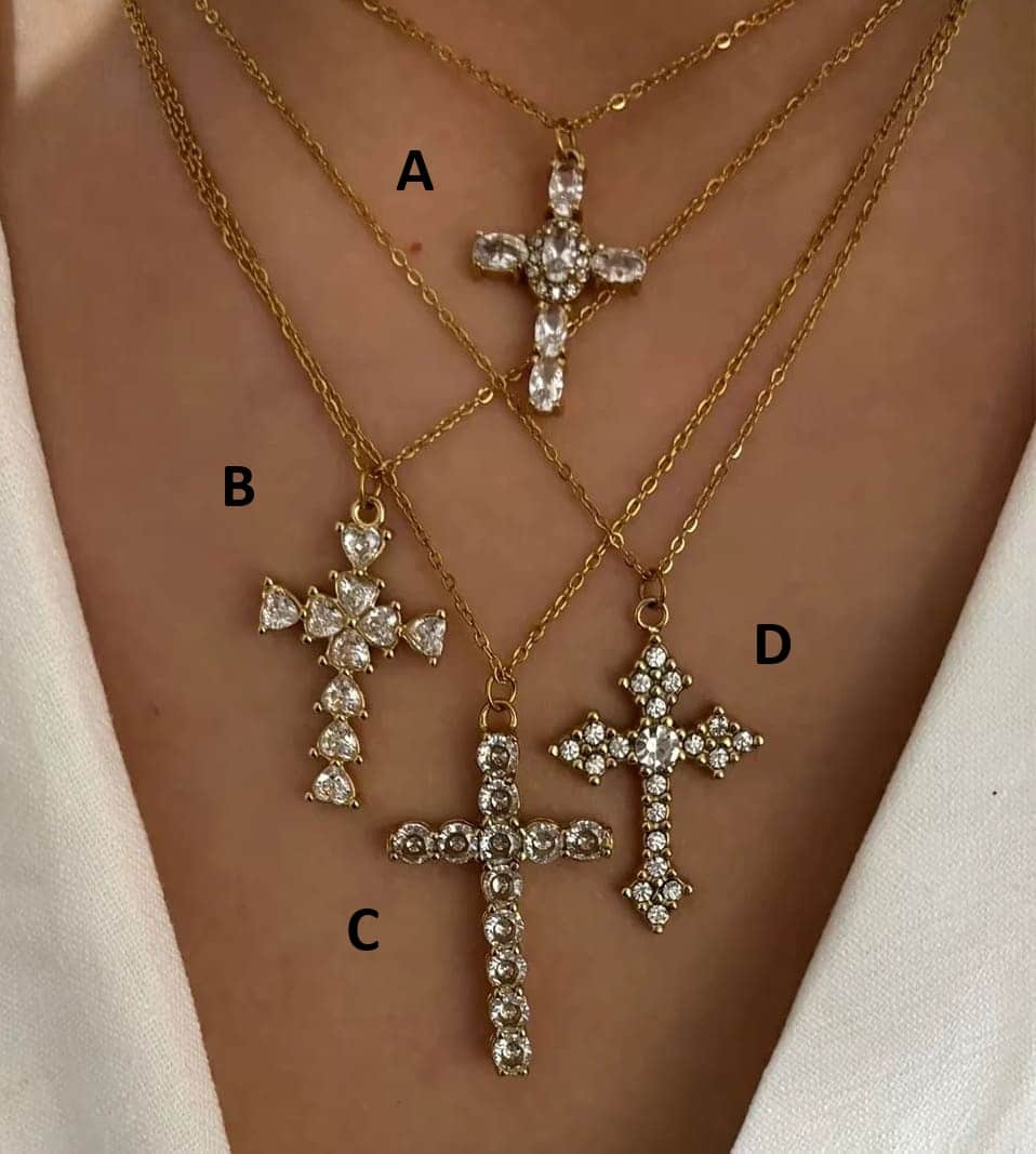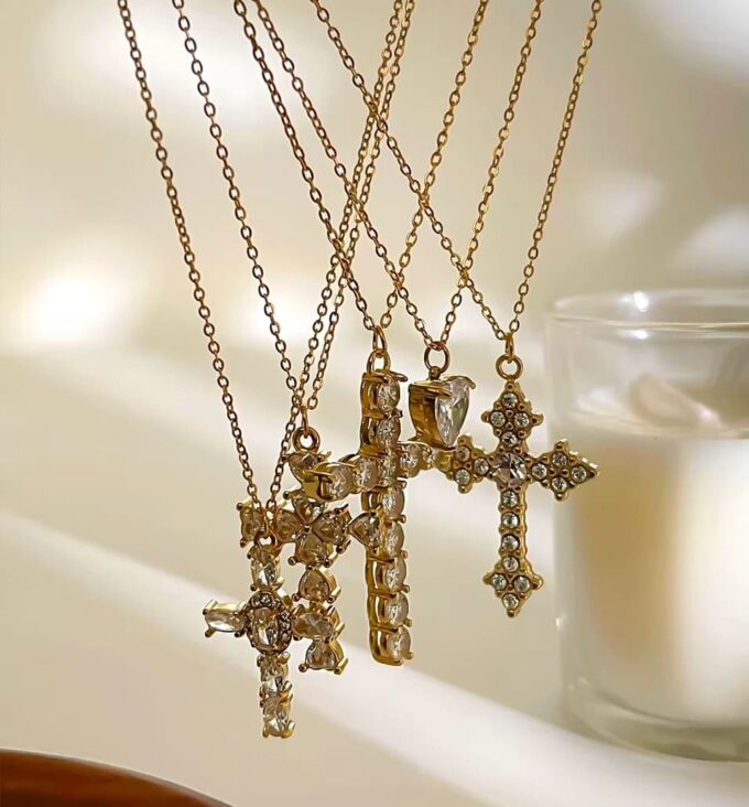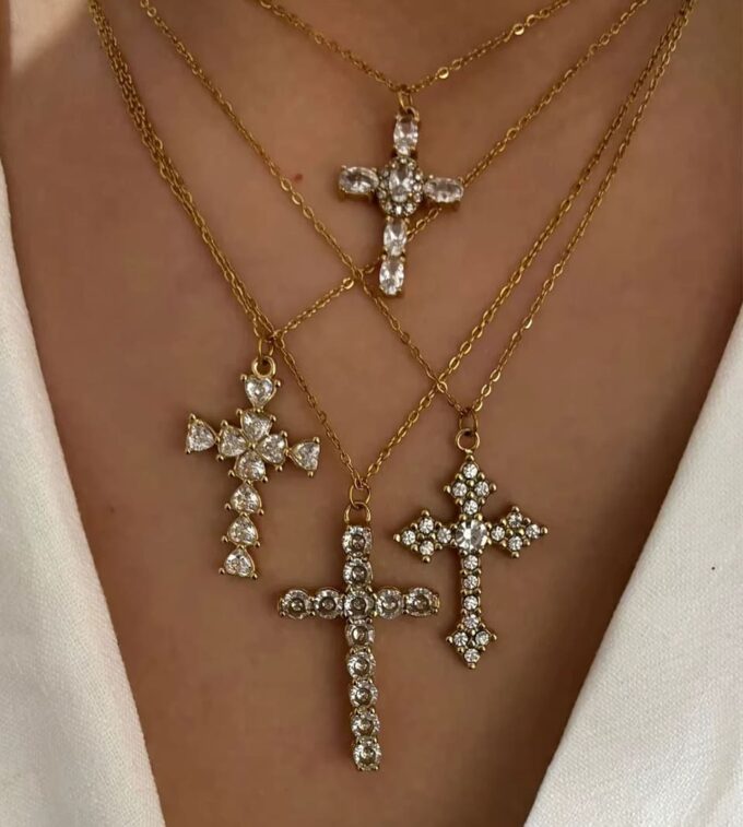 Cet ensemble réunit 4 colliers croix artisanaux en acier doré, chacun décoré de strass zirconium scintillants. Portés ensemble, ils créent une superposition spectaculaire, élégante et ultra tendance. Chaque collier croix possède son propre style, permettant de composer un layering harmonieux et riche en détails.