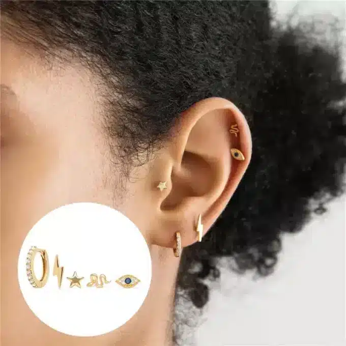 Ce bijou tendance est composé de 4 boucles d’oreilles clous en forme de serpent, éclair, oeil et étoile et d’une mini créole sertie d’oxydes de zirconium blancs en Argent 925 plaqué or. Vous pouvez les porter sur une oreille seule ou les répartir entre les deux pour une symétrie moderne, ensemble ou séparemment.