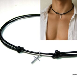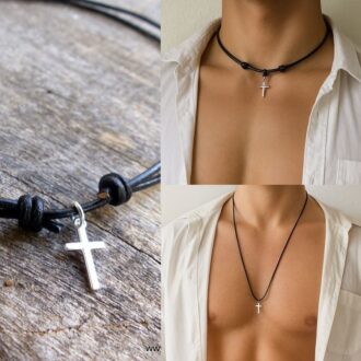 Collier nœud coulissant artisanal pour homme – Pendentif croix chrétienne en argent 925 sur cordon cuir réglable