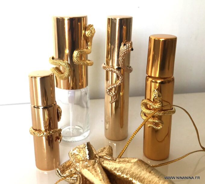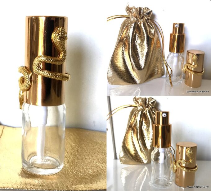 Composé d’un flacon verre transparent cylindrique muni d’une pompe doseuse en métal or sur lequel s’enroule un serpent doré, il se glisse dans une trousse beauté, une valise ou un sac à main.