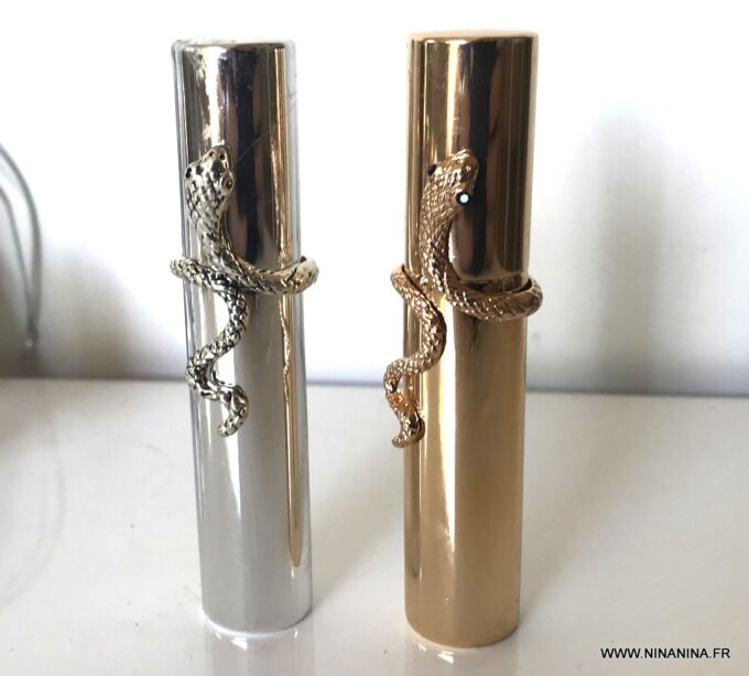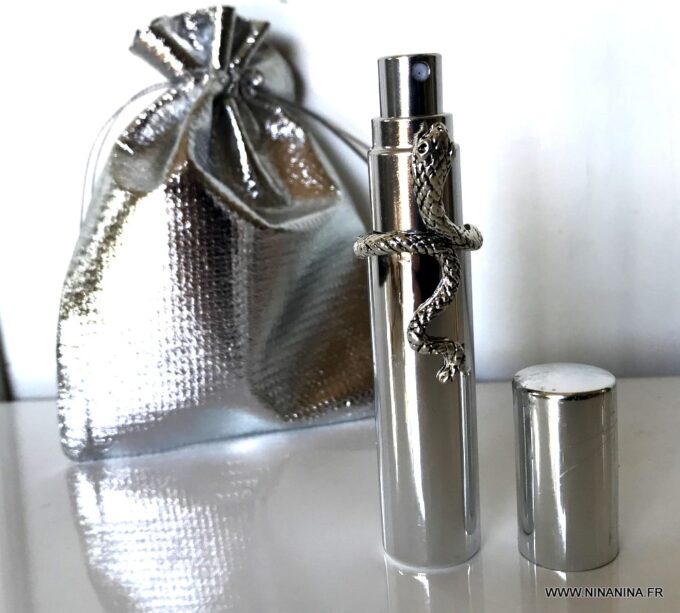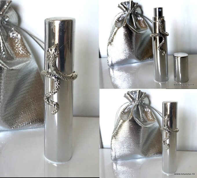 Composé d’un flacon parfum rechargeable cylindrique argenté sur lequel s’enroule un serpent, il se glisse dans une trousse beauté, une valise ou un sac à main.