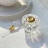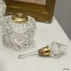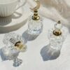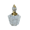Ce flacon en verre transparent sculpté offre un jeu de reflets subtils qui captent la lumière, créant une atmosphère élégante et sophistiquée. Sa silhouette facettée, inspirée des flacons de parfumerie vintage, est rehaussée par des finitions dorées et un bouchon en pointe délicatement taillé.