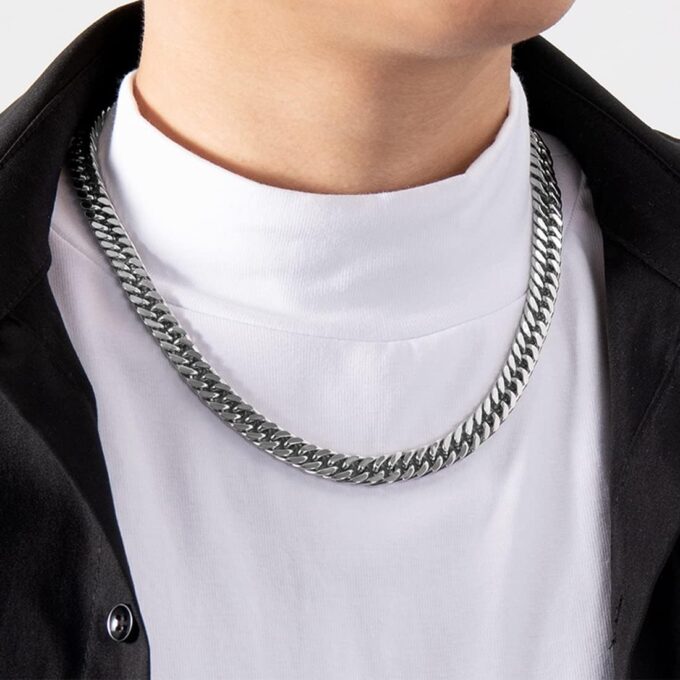 Ce collier homme à grosse maille en acier chirurgical de couleur argentée est constituée de mailles de 11 mm de large. Elle est équipée d’un fermoir à mousqueton classique qui le rendra très facile à mettre autour du cou, de manière parfaitement sécurisée.