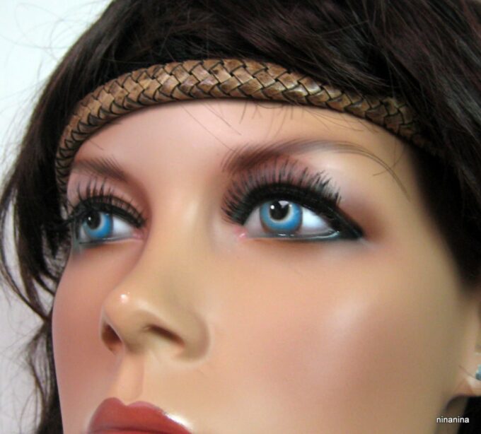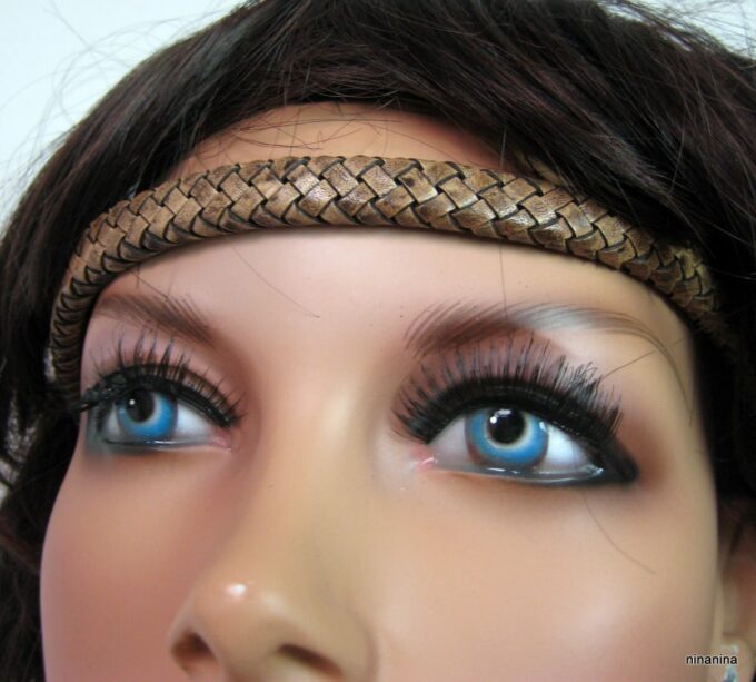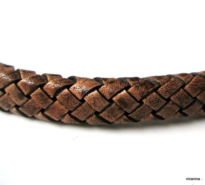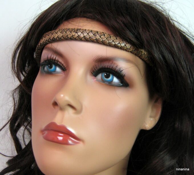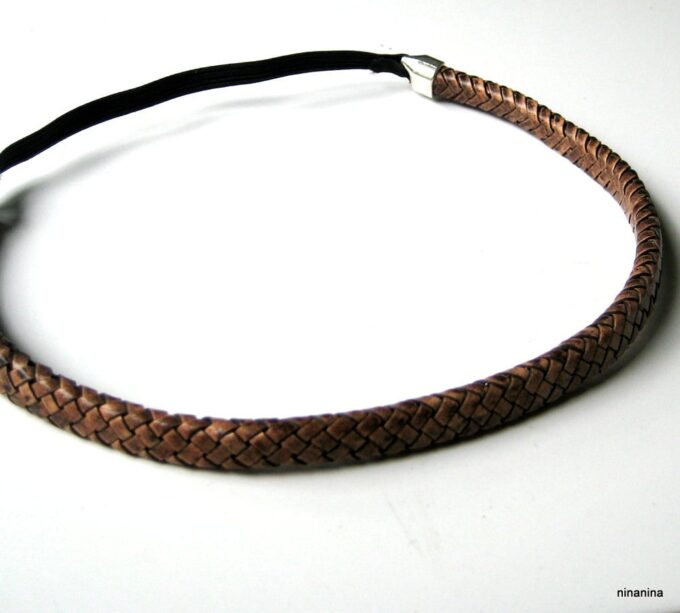 Headband cuir tressé composé d’un bandeau de cuir tressé marron clair monté sur un fermoir double en métal argenté. Largeur du bandeau : 1 cm. Epaisseur : 0,5 cm. Dim du fermoir : 1,2 X 3,5 cm. Longueur totale (fermoir compris): 53 cm ajustable. Fermeture elastique. Existe aussi avec un lacet marron chocolat. Livré dans sa pochette d’organza. Bijou 100% fait main.