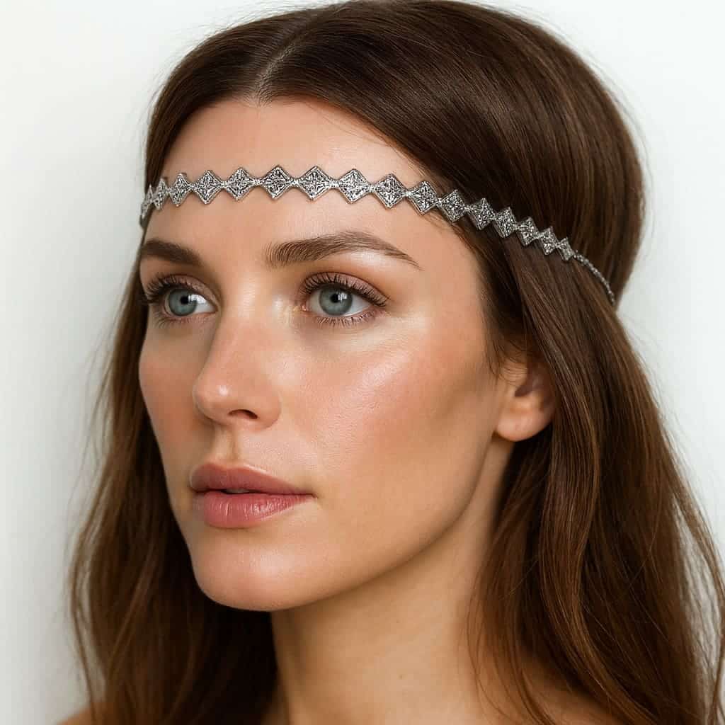 Ce headband argenté se porte aussi bien sur le front pour un style bohème chic que sur le haut de la tête pour un look élégant et romantique.