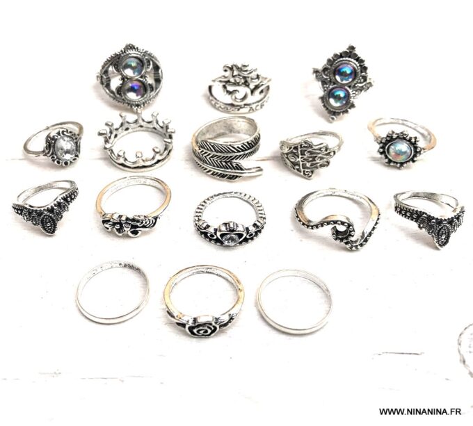 Assortiment de bagues bohème fantaisie argenté