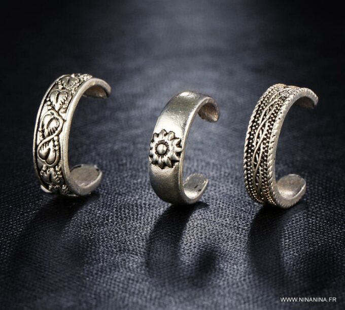 Lot de 3 bagues de pied en métal argenté composé d’anneaux ajustables ciselés en métal argenté.