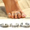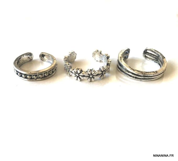 Bagues pour pieds boheme chic argentées – lot de 3 composé d’anneaux ajustables ciselés en métal argenté pour orteils.